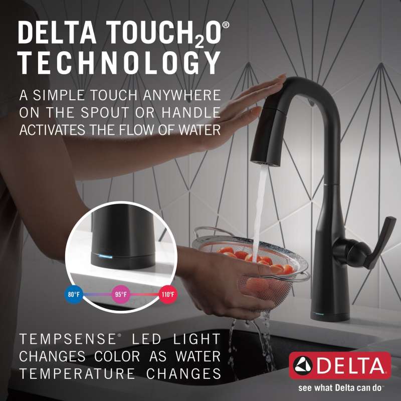 With subtly upturned spout and handles, stryke kitchen collection faucets radiate confidence and include thoughtful innovations to enhance everyday use. Touch it on. Touch it off. Whether you have two full hands or 10 messy fingers, delta touch2o technology helps keep your kitchen faucet clean, even when your hands aren’t. A simple touch anywhere on the spout or handle with your wrist or forearm activates the flow of water at the temperature where your handle is set. The delta tempsense led light changes color to alert you to the water’s temperature and eliminates any possible surprises or discomfort. You can install with confidence, knowing that delta kitchen faucets are backed by our lifetime limited warranty. Electronic parts are backed by our 5-year electronic parts warranty.