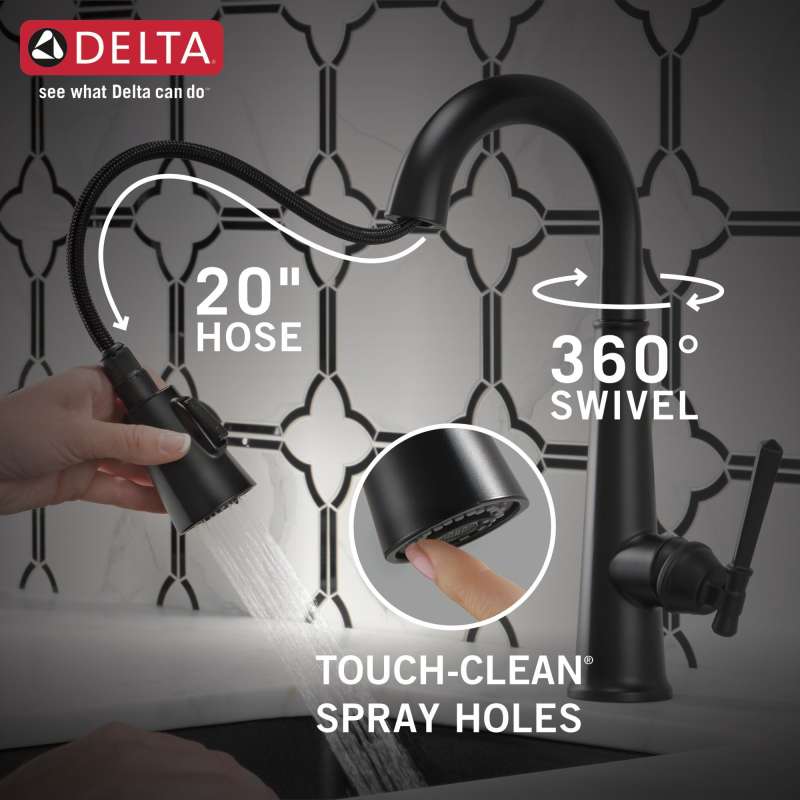 • The high-arc, gooseneck design swivels 360 degrees with a 20-in. Retractable hose for added convenience during everyday kitchen tasks.