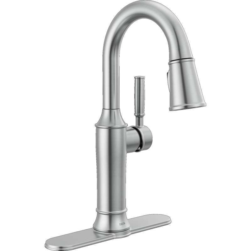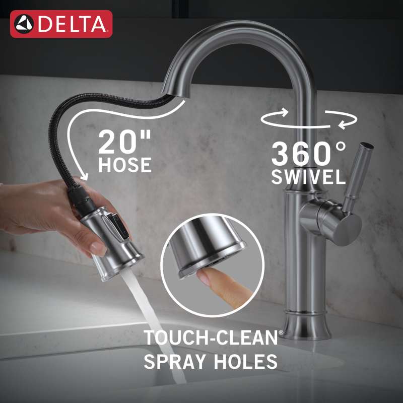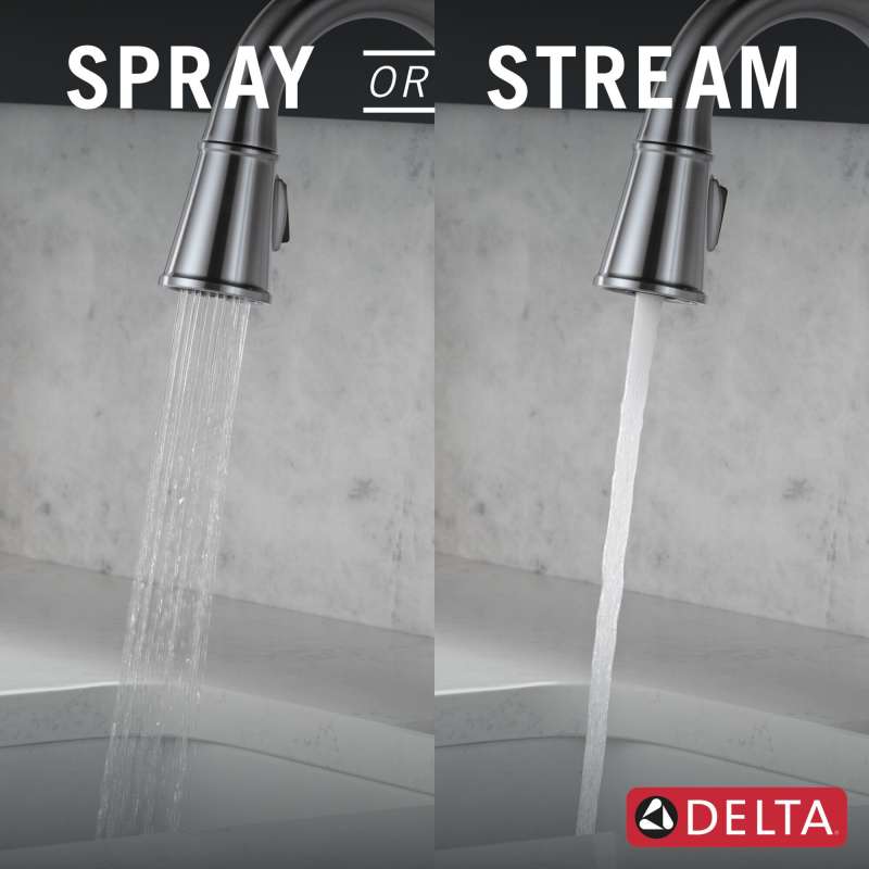 Command your kitchen with the symmetrical, statuesque design of the renaldi collection. The delta proclean kitchen spray provides a powerful, wide fan spray for quick and complete cleaning. Easily clean hard-to-reach places, help remove baked on messes and spray down your sink faster as the wide stream covers more surface area. Lumicoat finishes easily wipe clean without the need for cleaners or chemicals and are guaranteed to resist mineral buildup and hard water stains. The ultra-sleek surface repels liquids, resisting water spots and staying cleaner longer, so your faucet stays beautiful. Magnatite docking uses a powerful integrated magnet to set your pull down sprayer precisely into place and hold it there so it stays docked when not in use. You can install with confidence, knowing that delta kitchen faucets are backed by our lifetime limited warranty.