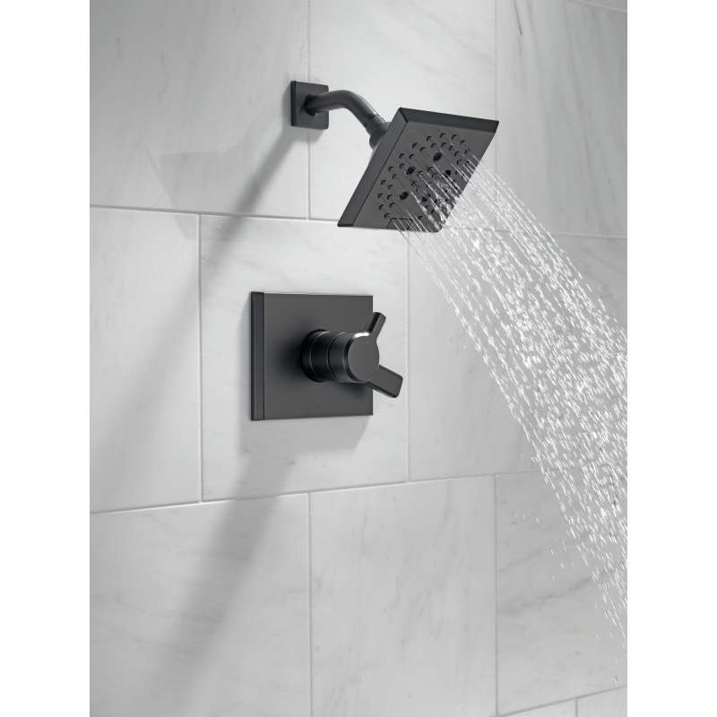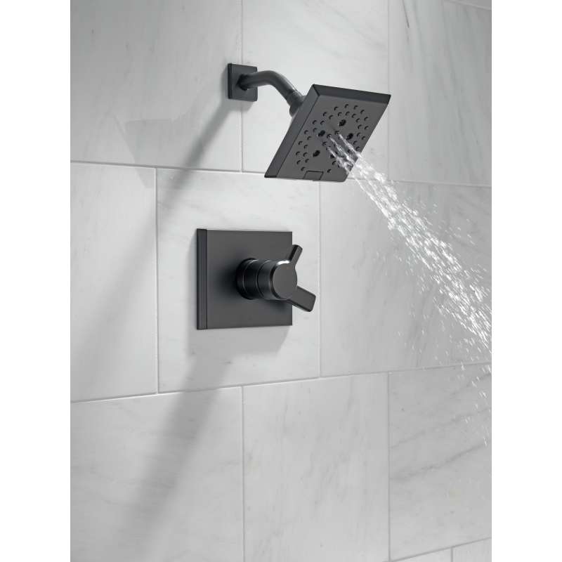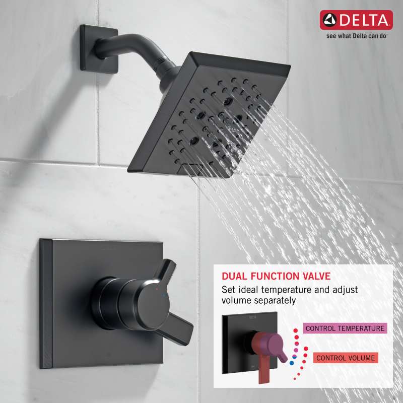 The confident slant of the Pivotal Bath Collection makes it a striking addition to a bathroom's contemporary geometry for a look that makes a statement. Delta H2Okinetic Showers look different because they are different. Using advanced technology, H2Okinetic showers sculpt water into a unique wave pattern, giving you 3X the coverage of a standard shower head. With separate handles for volume and temperature control, this Delta tub/shower provides a more refined showering experience. Simply set the water at your preferred temperature and turn the shower on or off with the volume control handle - without interrupting your set temperature. Matte Black makes a statement in your space, cultivating a sophisticated air and coordinating flawlessly with most other fixtures and accents. With bright tones, Matte Black is undeniably modern with a strong contrast, but it can complement traditional or transitional spaces just as well when paired against warm nuetrals for a rustic feel akin to cast iron. Coverage measured in accordance with EPA WaterSense Specification for shower heads, March 4, 2010.