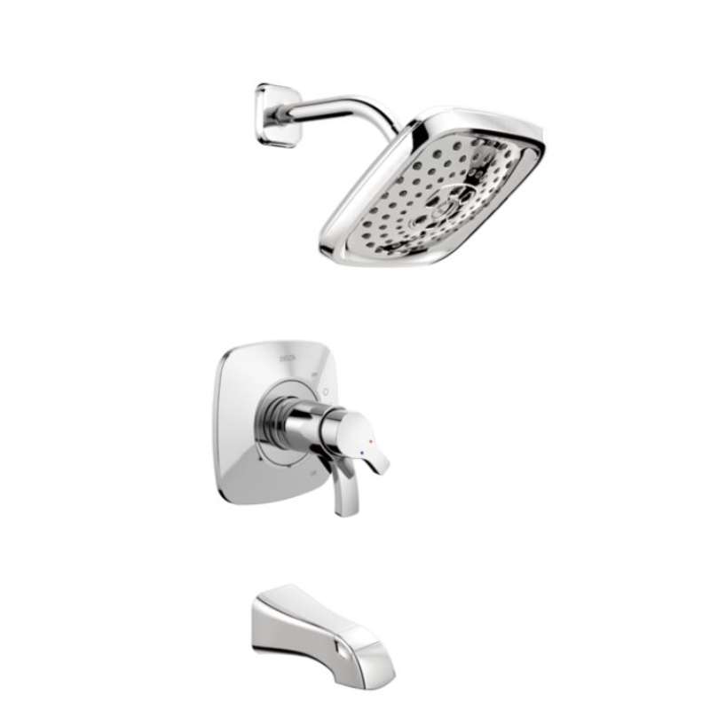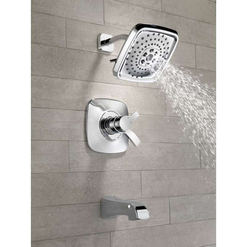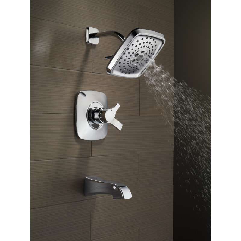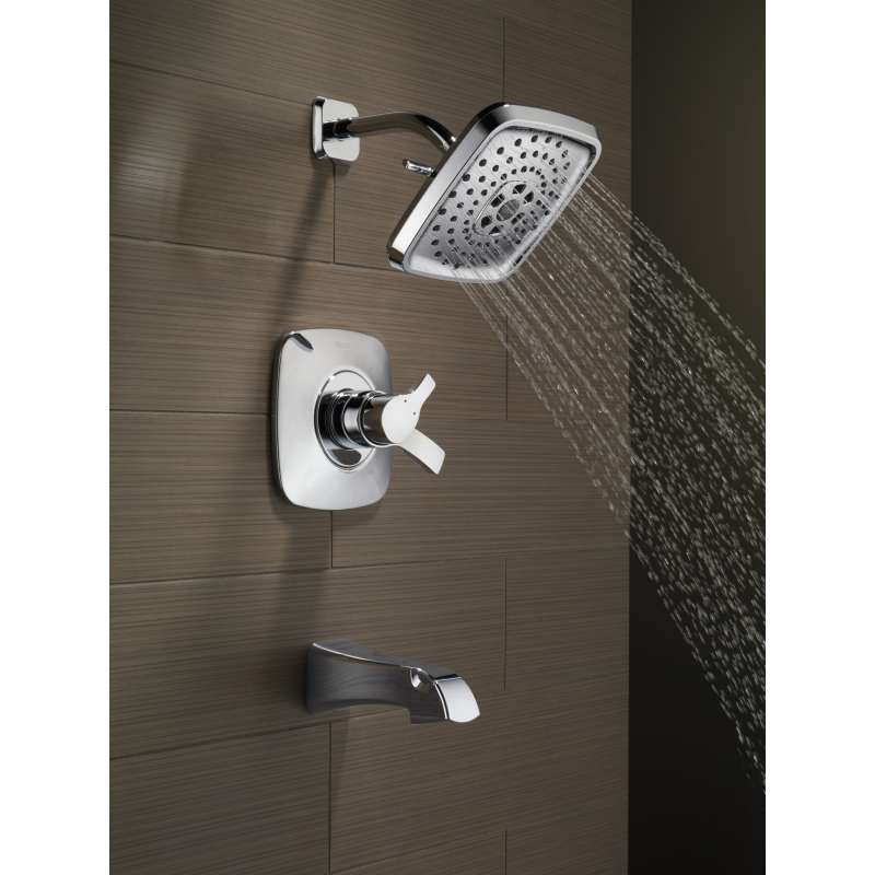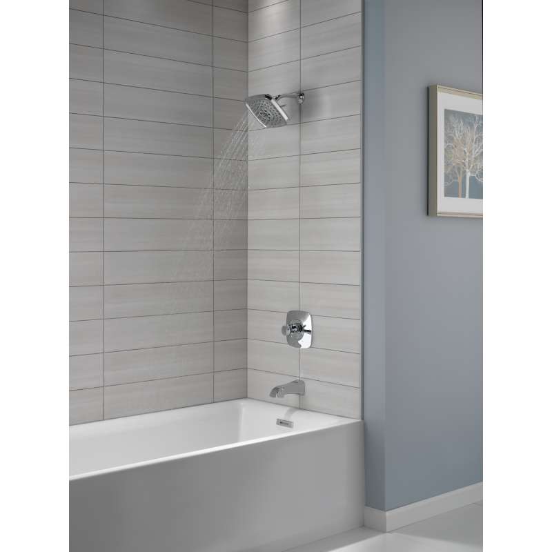 Delta H2Okinetic Showers look different because they are different. Using advanced technology, H2Okinetic showers sculpt water into a unique wave pattern, giving you 3X the coverage of a standard shower head. The end result is a shower that provides more coverage, more warmth and more intensity for a truly drenching shower experience. With separate handles for volume and temperature control, this Delta tub/shower provides a more refined showering experience. Simply set the water at your preferred temperature and turn the shower on or off with the volume control handle - without interrupting your set temperature. While other products may gather unsightly mineral build-up over time, Delta soft rubber Touch-Clean spray holes allow any mineral residue to simply be wiped away for an instantly refreshed look – with no need for soaking or the aid of chemical cleaners. The pause setting gives you ample space for shaving, lathering and other shower tasks, then easily restarts the water with the temperature where you left off. This spray setting helps you conserve water, so you can worry less about depleting your supply of hot water - and you help the environment too. Delta pressure-balance valves use Monitor Technology to protect you and your family from sudden temperature changes. Chrome has rapidly become one of the most popular finishes across decor styles in the bath thanks to its stunning gloss and innate versatility. Paired with crisp lines and bright whites, it creates a bold, modern contrast, but it works equally well with vintage styles and traditional spaces to convey a hint of nostalgia. Delta WaterSense labeled faucets, showers and toilets use at least 20 percent less water than the industry standard—saving you money without compromising performance.
