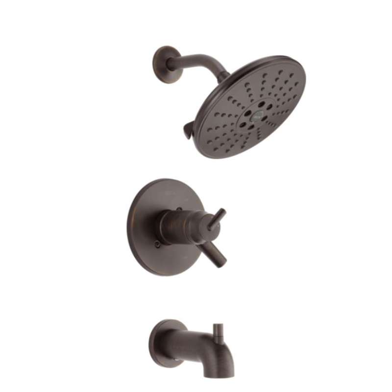 Delta H2Okinetic Showers look different because they are different. Using advanced technology, H2Okinetic showers sculpt water into a unique wave pattern, giving you 3X the coverage of a standard shower head. The end result is a shower that provides more coverage, more warmth and more intensity for a truly drenching shower experience. With separate handles for volume and temperature control, this Delta tub/shower provides a more refined showering experience. Simply set the water at your preferred temperature and turn the shower on or off with the volume control handle - without interrupting your set temperature. The pause setting gives you ample space for shaving, lathering and other shower tasks, then easily restarts the water with the temperature where you left off. This spray setting helps you conserve water, so you can worry less about depleting your supply of hot water - and you help the environment too. Delta thermostatic valves use TempAssure Technology to protect you and your family from sudden temperature changes. An ornate blend of deep, warm tones and subtle highlights give Venetian Bronze a hand-brushed look that can transform a bath. Offering a smooth contrast to light tones and coordinating well with darker ones, this finish can have a beautiful soothing effect on almost any space. Delta WaterSense labeled faucets, showers and toilets use at least 20 percent less water than the industry standard—saving you money without compromising performance.