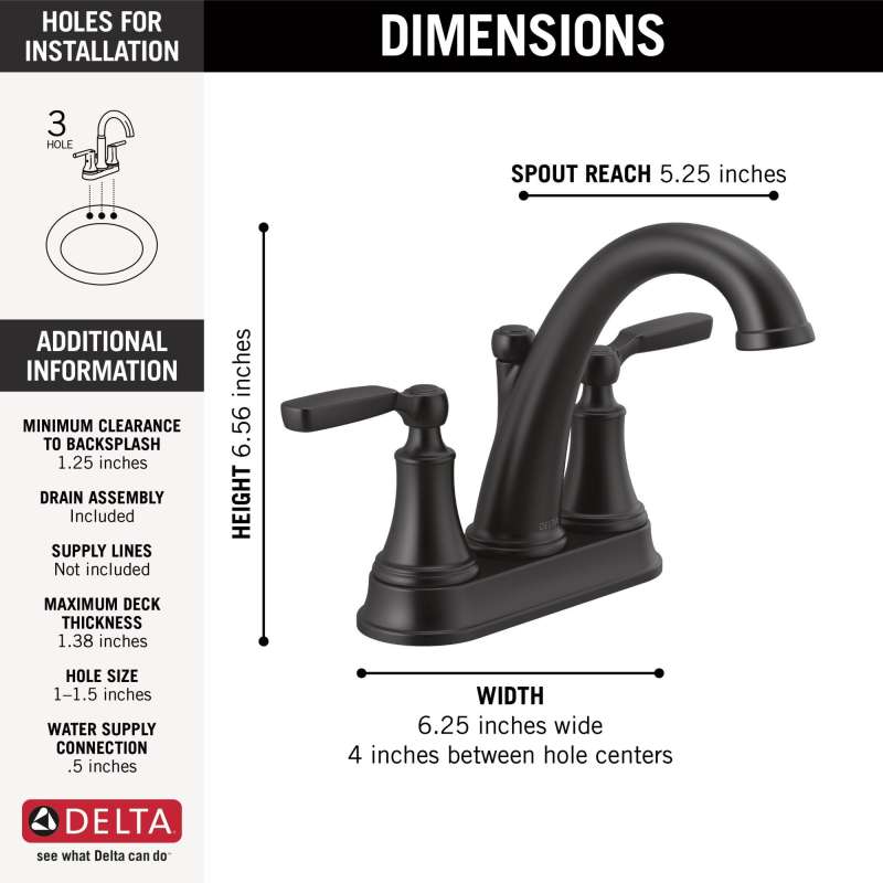 The woodhurst bath collection’s refined style and forward-leaning spout lends an alluring charm to your bath, while the button-cap detailing gives a classic familiarity. Delta faucets with diamond seal technology perform like new for life with a patented design which reduces leak points, is less hassle to install and lasts twice as long as the industry standard. Watersense labeled faucets use at least 20% less water than the industry standard — helping you save water without compromising performance. You can install with confidence, knowing that delta faucets are backed by our lifetime limited warranty.