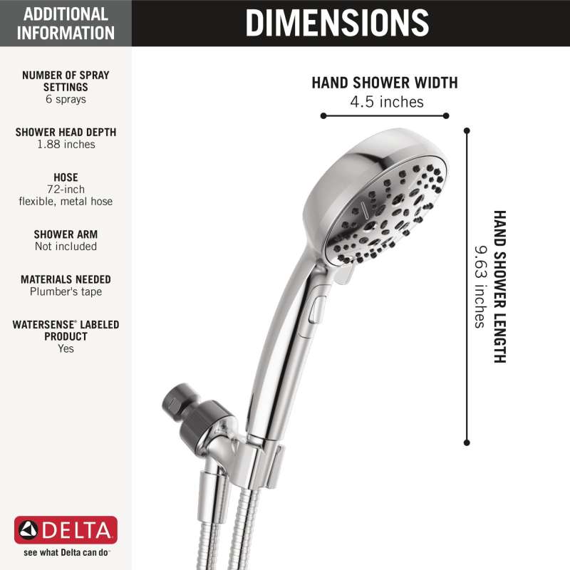 Experience a better shower with the control and flexibility of a Delta hand shower. Our H2Okinetic Showers are powered by an innovative technology that sculpts the water into a unique wave pattern, giving you the feeling of more water and water pressure. Delta WaterSense labeled showers use at least 20% less water than the industry standard — helping you save water without compromising performance. You can install with confidence, knowing that Delta showers are backed by our Lifetime Limited Warranty.