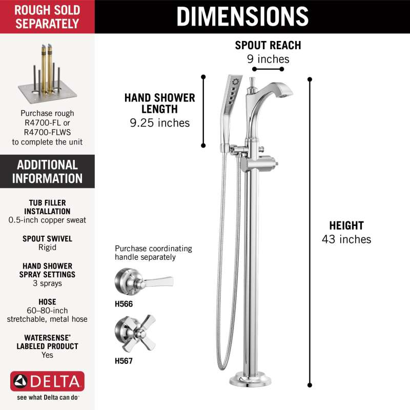 • T4756-LHP-FL Dorval Delta Dorval Single Handle Floor Mount Tub Filler Trim-Less Handle, Chrome Chrome