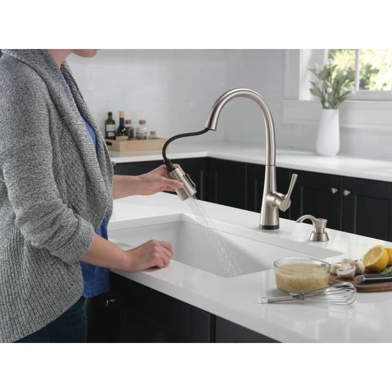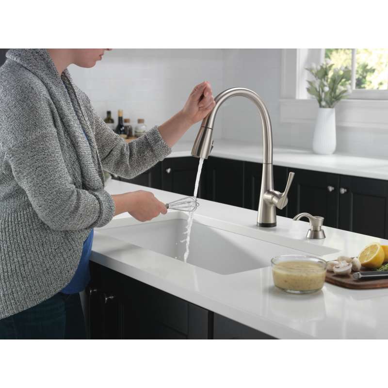 The auburn kitchen faucet features clean lines and sculpted details in a transitional style. Touch it on. Touch it off. Whether you have two full hands or 10 messy fingers, delta touch2o technology helps keep your kitchen faucet clean, even when your hands aren’t. A simple touch anywhere on the spout or handle with your wrist or forearm activates the flow of water at the temperature where your handle is set. The delta tempsense led light changes color to alert you to the water’s temperature and eliminates any possible surprises or discomfort. You can install with confidence, knowing that delta kitchen faucets are backed by our lifetime limited warranty. Electronic parts are backed by our 5-year electronic parts warranty.