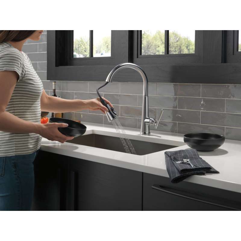 The defined ridges of the emmeline kitchen collection’s diamond-shaped spout cut a streamlined profile, balanced by captivating details that lend an elemental sense of old-world flair. Kitchen sink faucets with touch-clean spray holes allow you to easily wipe away calcium and lime build-up with the touch of a finger. Delta shieldspray technology cleans with laser-like precision while containing mess and splatter. A concentrated jet powers away stubborn messes while an innovative shield of water contains splatter and clears off the mess, so you can spend less time soaking, scrubbing and shirt swapping. Delta lumicoat finishes are guaranteed to resist water spots and mineral buildup and easily wipe clean without the need for cleaners or chemicals. The ultra-sleek surface repels liquids, resisting water spots and staying cleaner longer, so your faucet stays beautiful. Delta kitchen faucets with diamond seal technology perform like new for life with a patented design which reduces leak points, is less hassle to install and lasts twice as long as the industry standard. You can install with confidence, knowing that delta kitchen faucets are backed by our lifetime limited warranty.