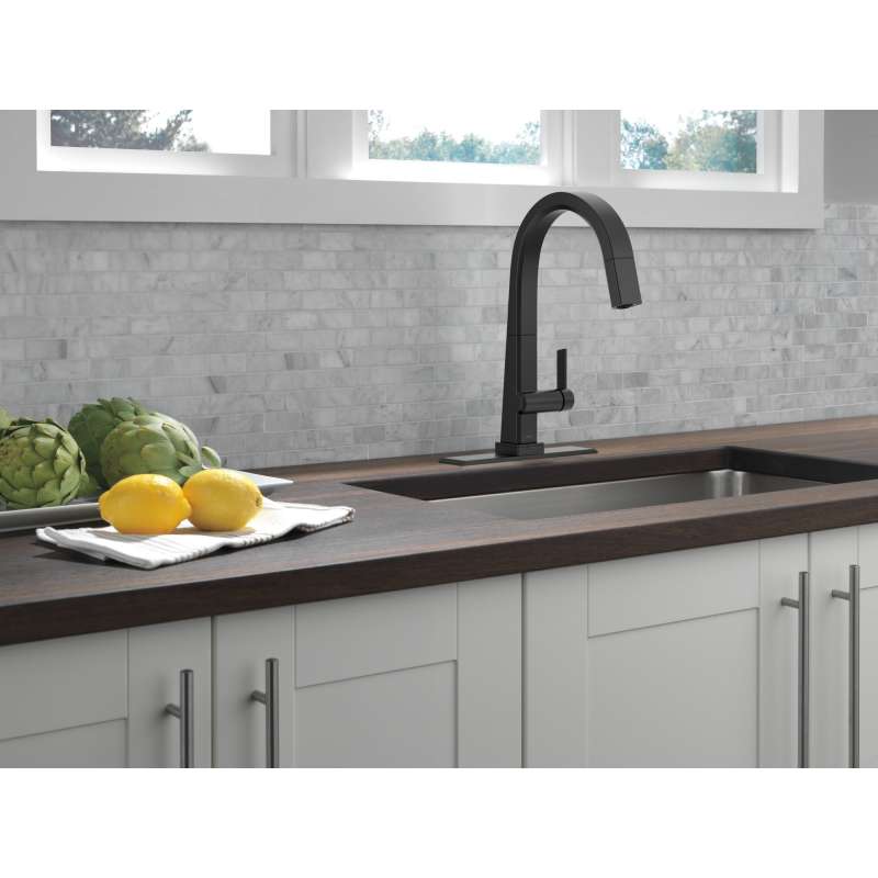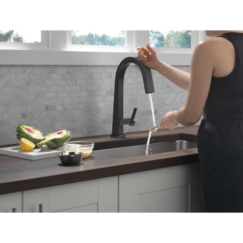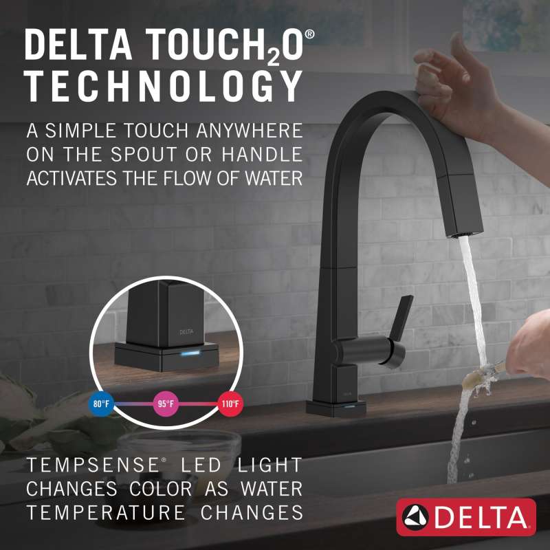 The confident slant of the pivotal collection makes it a striking addition to your kitchen’s contemporary geometry for a look that makes a statement. Touch it on. Touch it off. Whether you have two full hands or 10 messy fingers, delta touch2o technology helps keep your faucet clean, even when your hands aren’t. A simple touch anywhere on the spout or handle with your wrist or forearm activates the flow of water at the temperature where your handle is set. The delta tempsense led light changes color to alert you to the water’s temperature and eliminate any possible surprises or discomfort. Delta magnatite docking uses a powerful integrated magnet to pull your faucet spray wand precisely into place and hold it there so it stays docked when not in use. Delta faucets with diamond seal technology perform like new for life with a patented design which reduces leak points, is less hassle to install and lasts twice as long as the industry standard. You can install with confidence, knowing that delta faucets are backed by our lifetime limited warranty. Electronic parts are backed by our 5-year electronic parts warranty. Industry standard is based on asme a112.18.1 of 500,000 cycles.