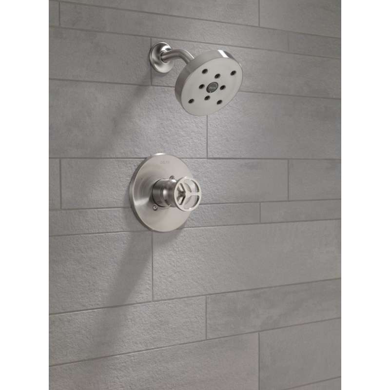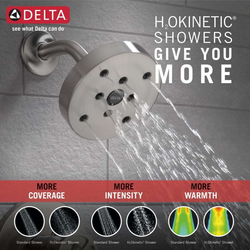 Inspired by the sleek elegance of modern european design, the trinsic bath collection is perfect for any contemporary bath and now features a wheel handle option for an industrial look. Delta h2okinetic showers use advanced technology to sculpt water into a unique wave pattern that gives you 3x the coverage of a standard shower head, resulting in a truly drenching shower experience that provides more coverage, more warmth and more intensity. Delta showers with monitor pressure-balance valves are engineered to make sure you don’t experience a sudden and possibly unsafe change in water temperature as a result of running water elsewhere, such as using a dishwasher, flushing a toilet or running a washing machine. You can install with confidence, knowing delta products are backed by our limited lifetime warranty.
