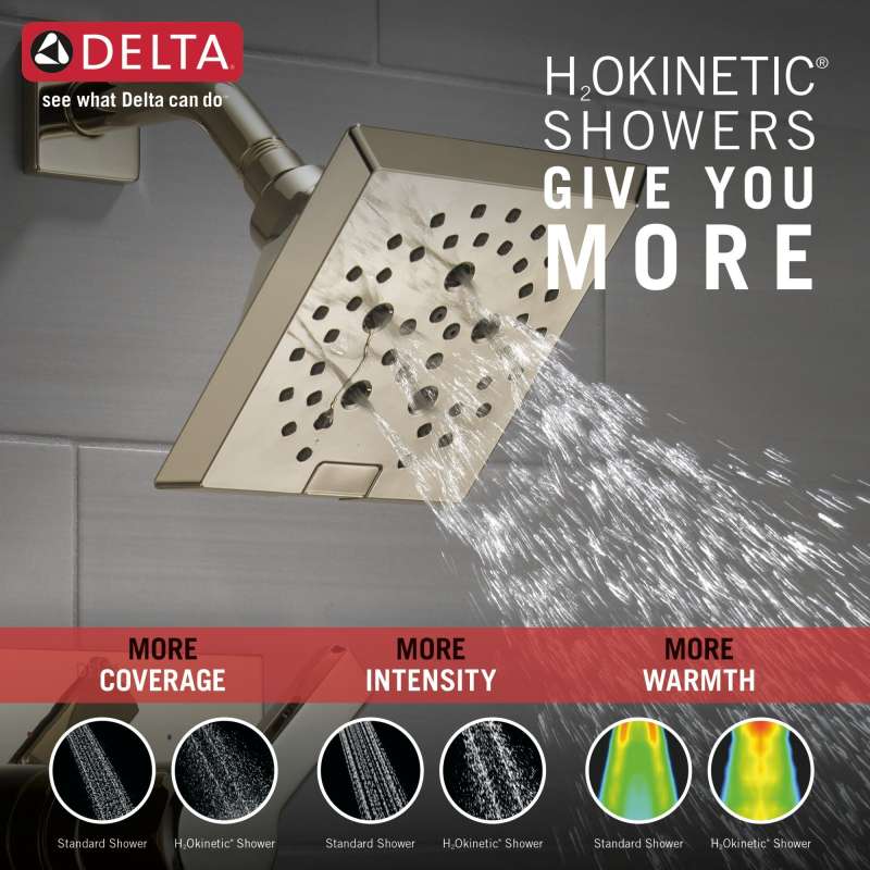 The confident slant of the pivotal bath collection makes it a striking addition to a bathroom's contemporary geometry for a look that makes a statement. Delta showers with monitor pressure-balance valves are engineered to make sure you don’t experience a sudden and possibly unsafe change in water temperature as a result of running water elsewhere, such as using a dishwasher, flushing a toilet or running a washing machine. Our h2okinetic showers look different because they are different. H2okinetic showers are powered by an innovative technology that sculpts the water into a unique wave pattern, giving you the feeling of more water and water pressure. You can install with confidence, knowing that delta showers are backed by our lifetime limited warranty.