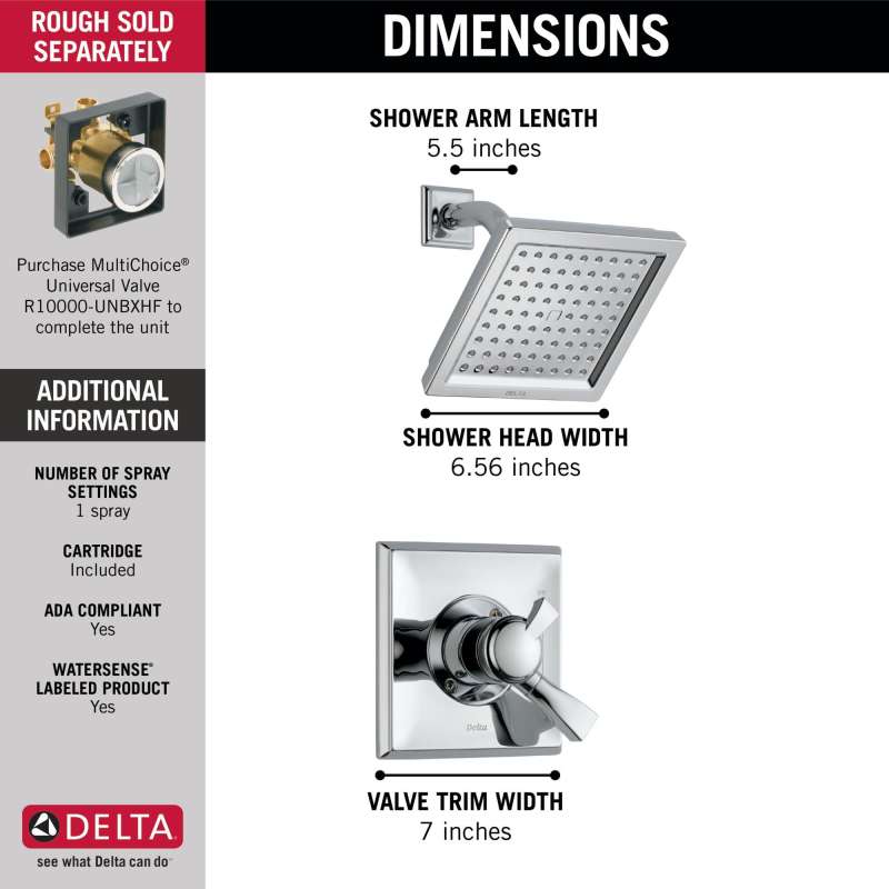 With separate handles for volume and temperature control, this delta tub/shower provides a more refined showering experience. Simply set the water at your preferred temperature and turn the shower on or off with the volume control handle - without interrupting your set temperature. While other products may gather unsightly mineral build-up over time, delta soft rubber touch-clean spray holes allow any mineral residue to simply be wiped away for an instantly refreshed look – with no need for soaking or the aid of chemical cleaners. Delta pressure-balance valves use monitor technology to protect you and your family from sudden temperature changes. Chrome has rapidly become one of the most popular finishes across décor styles in the bath thanks to its stunning gloss and innate versatility. Paired with crisp lines and bright whites, it creates a bold, modern contrast, but it works equally well with vintage styles and traditional spaces to convey a hint of nostalgia. Delta watersense labeled faucets, showers and toilets use at least 20% less water than the industry standard—saving you money without compromising performance.