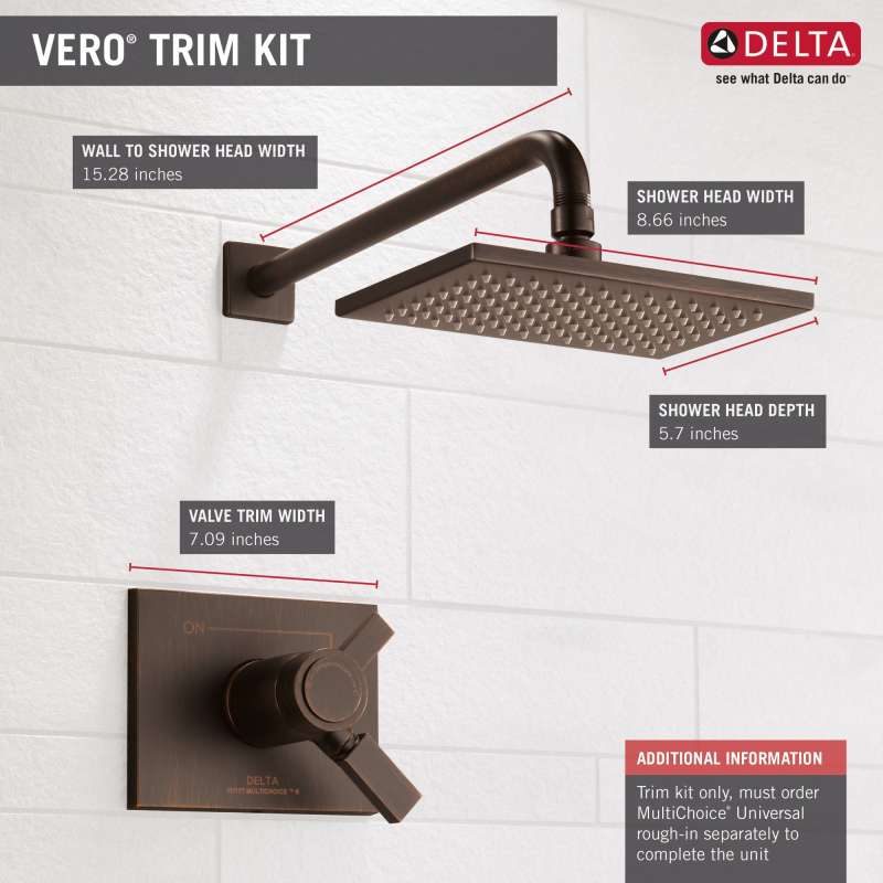 Inspired by the slim lines and graceful arc of a ribbon, the vero bath collection offers a high-end, modern look. With separate handles for volume and temperature control, this delta tub/shower provides a more refined showering experience. Simply set the water at your preferred temperature and turn the shower on or off with the volume control handle - without interrupting your set temperature. While other products may gather unsightly mineral build-up over time, delta soft rubber touch-clean spray holes allow any mineral residue to simply be wiped away for an instantly refreshed look – with no need for soaking or the aid of chemical cleaners. Delta thermostatic valves use tempassure technology to protect you and your family from sudden temperature changes. An ornate blend of deep, warm tones and subtle highlights give venetian bronze a hand-brushed look that can transform a bath. Offering a smooth contrast to light tones and coordinating well with darker ones, this finish can have a beautiful soothing effect on almost any space.