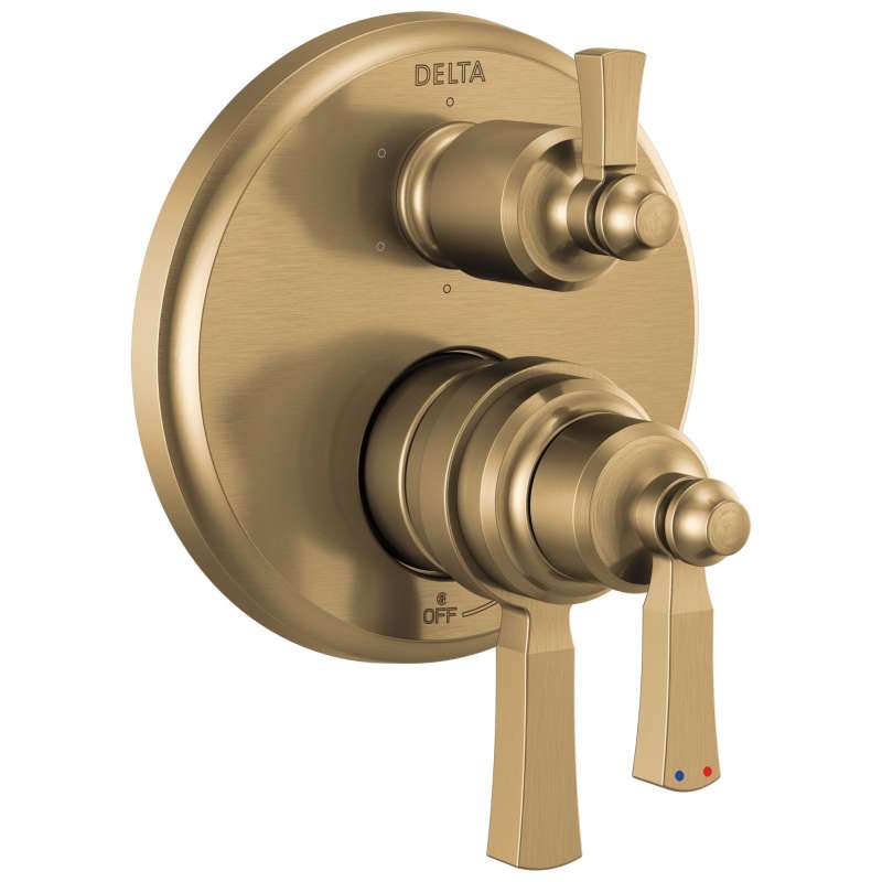 The dorval bathroom collection diverges from conventional expectations with regal accents and a powerful design that commands your attention. Inspired by the feminine lines of french architecture and the regal stature of german castles, the dorval bath collection balances grace and power in this modern take on new traditional design. With separate handles for volume and temperature control, this delta tub/shower provides a more refined showering experience. Simply set the water at your preferred temperature and turn the shower on or off with the volume control handle - without interrupting your set temperature. Delta pressure-balance valves use monitor technology to protect you and your family from sudden temperature changes.