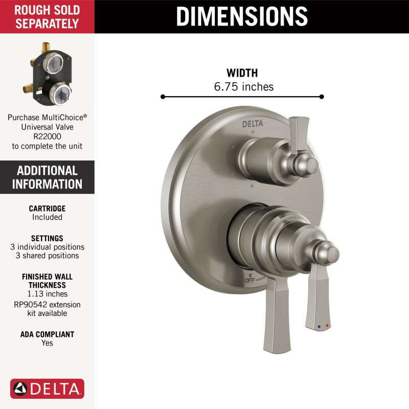 The dorval bathroom collection diverges from conventional expectations with regal accents and a powerful design that commands your attention. Inspired by the feminine lines of french architecture and the regal stature of german castles, the dorval bath collection balances grace and power in this modern take on new traditional design. With separate handles for volume and temperature control, this delta tub/shower provides a more refined showering experience. Simply set the water at your preferred temperature and turn the shower on or off with the volume control handle - without interrupting your set temperature. Delta pressure-balance valves use monitor technology to protect you and your family from sudden temperature changes.