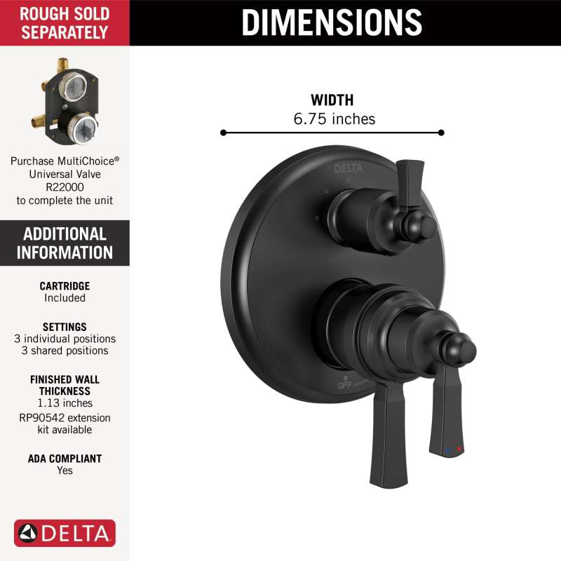 The dorval bathroom collection diverges from conventional expectations with regal accents and a powerful design that commands your attention. Inspired by the feminine lines of french architecture and the regal stature of german castles, the dorval bath collection balances grace and power in this modern take on new traditional design. With separate handles for volume and temperature control, this delta tub/shower provides a more refined showering experience. Simply set the water at your preferred temperature and turn the shower on or off with the volume control handle - without interrupting your set temperature. Delta thermostatic valves use tempassure technology to protect you and your family from sudden temperature changes.