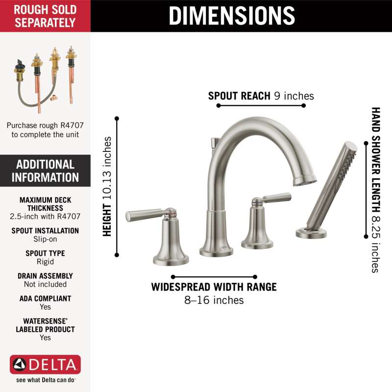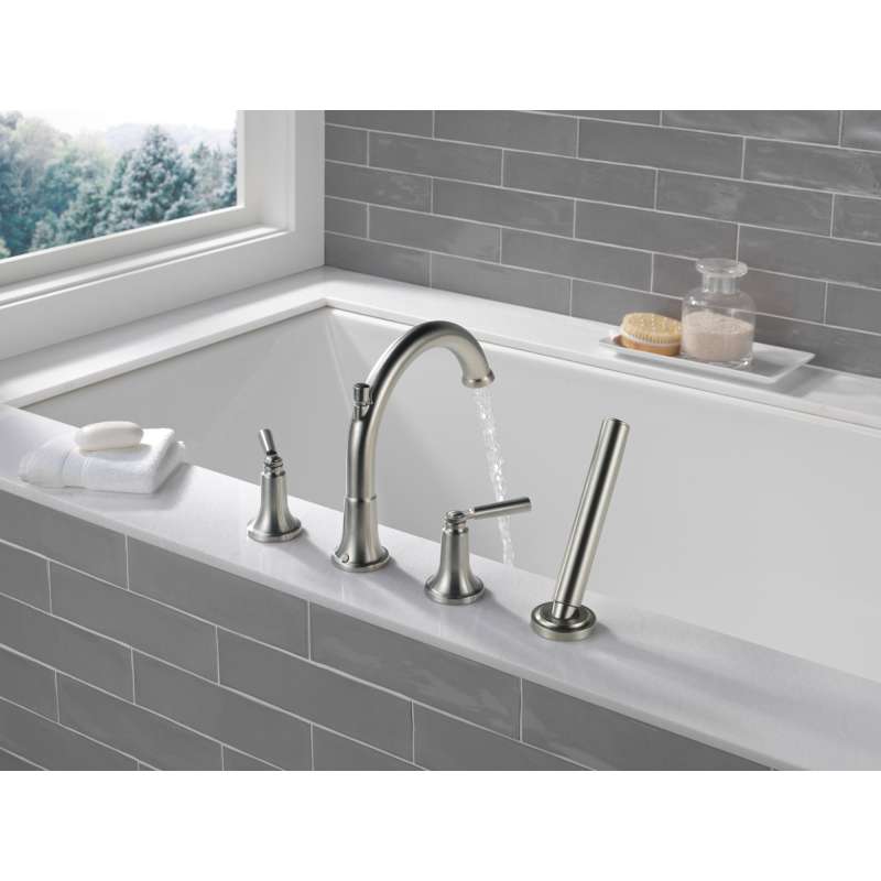 Complete your bath with a beautifully designed Delta Roman tub faucet with hand shower, meticulously crafted to turn heads and enhance your experience. The Saylor Bath Collection is an intriguing blend of traditional and contemporary design elements with strong, geometric forms and hints of industrial style in the handles. You can install with confidence, knowing that Delta faucets are backed by our Lifetime Limited Warranty.
