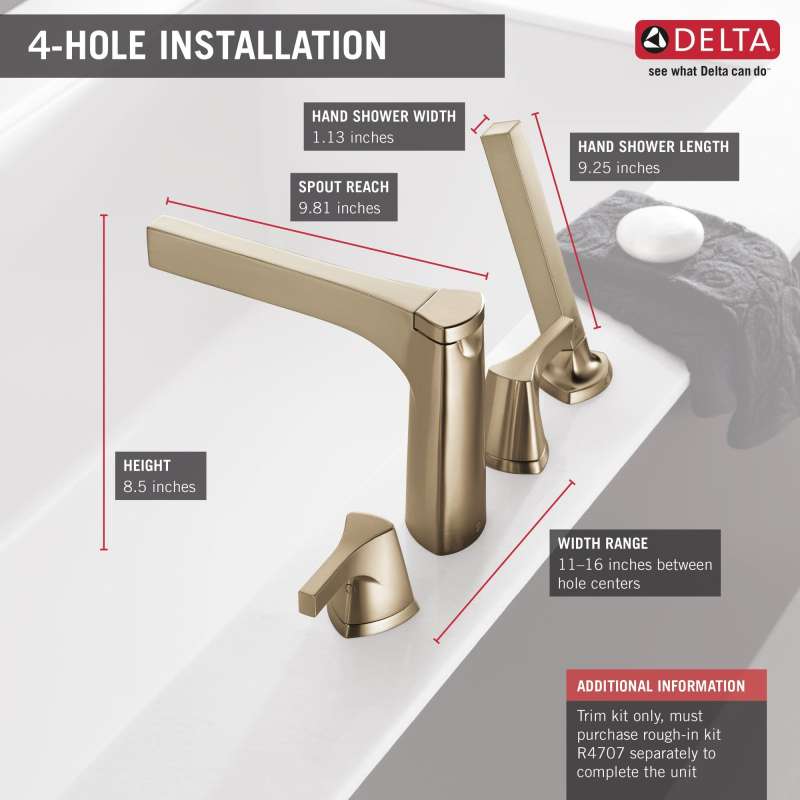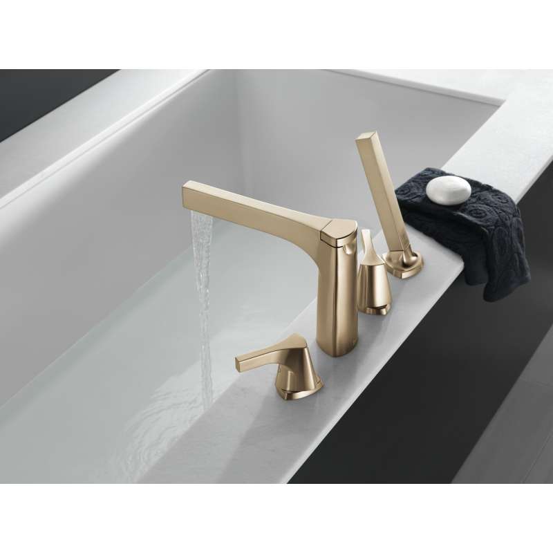 Complete your bath with a beautifully designed Delta roman tub faucet, meticulously crafted to turn heads and enhance your experience. The included hand shower makes this a versatile addition to your bath, perfect for rinsing off, washing loved ones and pets or keeping your tub clean. Delta H2Okinetic Hand Showers look different because they are different. Using advanced technology, H2Okinetic Hand Showers sculpt water into a unique wave pattern, giving you 3X the coverage of a standard shower head. The end result is a hand shower that provides more coverage, more warmth and more intensity for a truly drenching experience. Designed to look like new for life, Brilliance finishes are developed using a proprietary process that creates a durable, long-lasting finish that is guaranteed not to corrode, tarnish or discolor. Take the chill out of contemporary with the eloquent warmth of Champagne Bronze in your bath. This vibrant, gold finish provides a vivid splash of contrast to your space for a look that's simultaneously modern and nimble, able to pair elegantly with traditional, transitional, and contemporary décor. You can install with confidence, knowing that Delta faucets are backed by our Lifetime Limited Warranty. Coverage measured in accordance with EPA WaterSense Specification for shower heads, March 4, 2010.