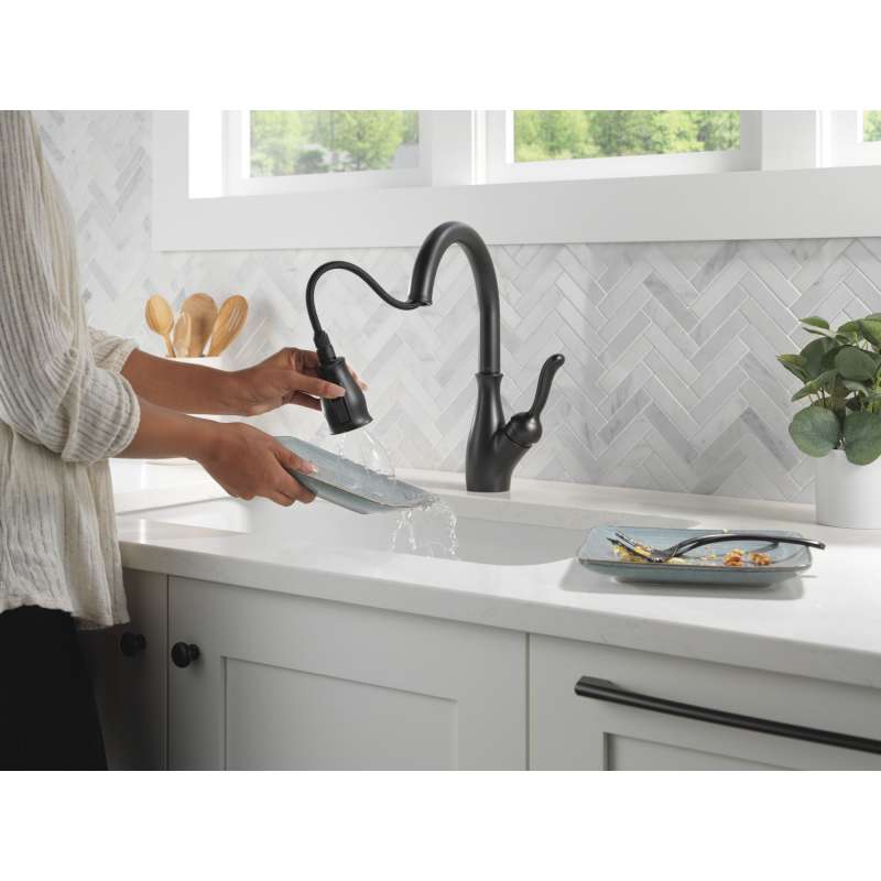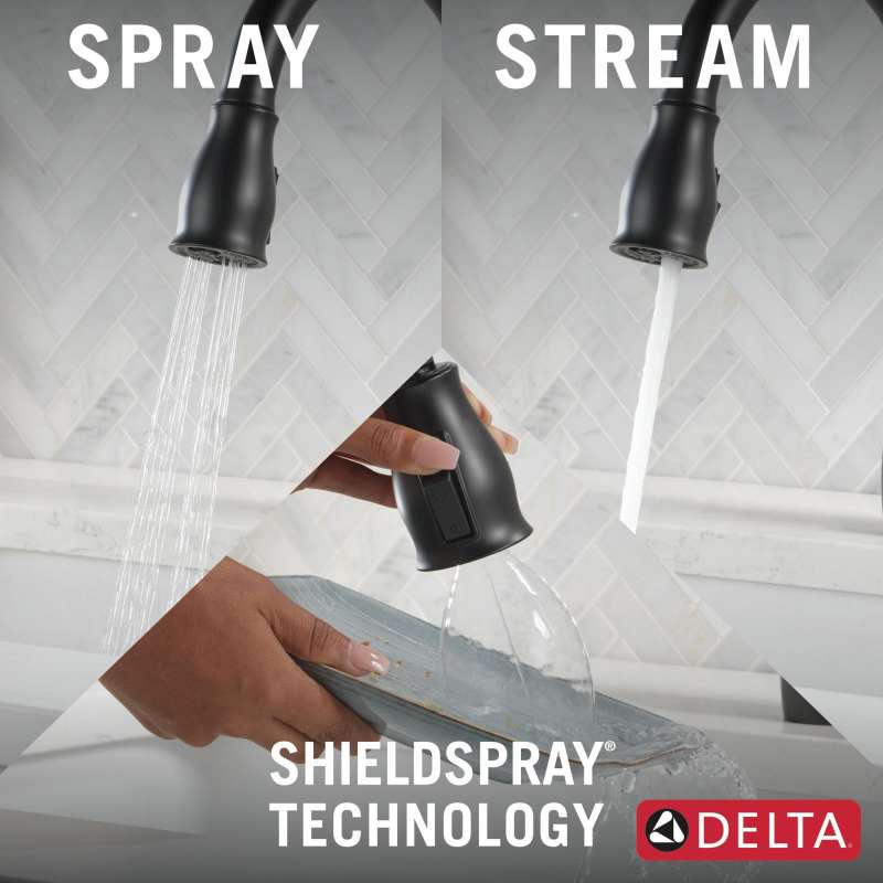 Delta magnatite docking uses a powerful integrated magnet to pull your faucet spray wand precisely into place and hold it there so it stays docked when not in use. Delta shieldspray technology cleans with laser-like precision while containing mess and splatter. A concentrated jet powers away stubborn messes while an innovative shield of water contains splatter and clears off the mess, so you can spend less time soaking, scrubbing and shirt swapping. Delta faucets with diamond seal technology perform like new for life with a patented design which reduces leak points, is less hassle to install and lasts twice as long as the industry standard. Kitchen faucets with touch-clean spray holes allow you to easily wipe away calcium and lime build-up with the touch of a finger. You can install with confidence, knowing that delta faucets are backed by our lifetime limited warranty. Industry standard is based on asme a112.18.1 of 500,000 cycles.