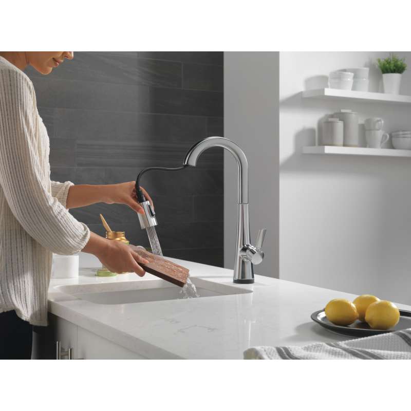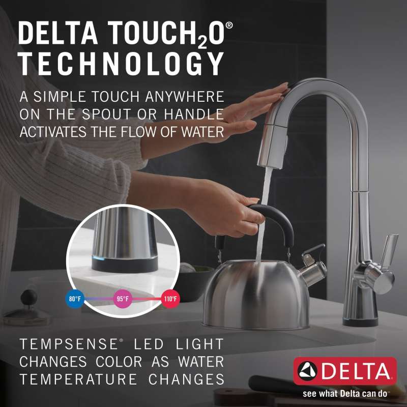 The monrovia kitchen collection stands out in any space with its statuesque form and striking handle design. Touch it on. Touch it off. Whether you have two full hands or 10 messy fingers, delta touch2o technology helps keep your kitchen faucet clean, even when your hands aren’t. A simple touch anywhere on the spout or handle with your wrist or forearm activates the flow of water at the temperature where your handle is set. The delta tempsense led light changes color to alert you to the water’s temperature and eliminates any possible surprises or discomfort. You can install with confidence, knowing that delta kitchen faucets are backed by our lifetime limited warranty. Electronic parts are backed by our 5-year electronic parts warranty.