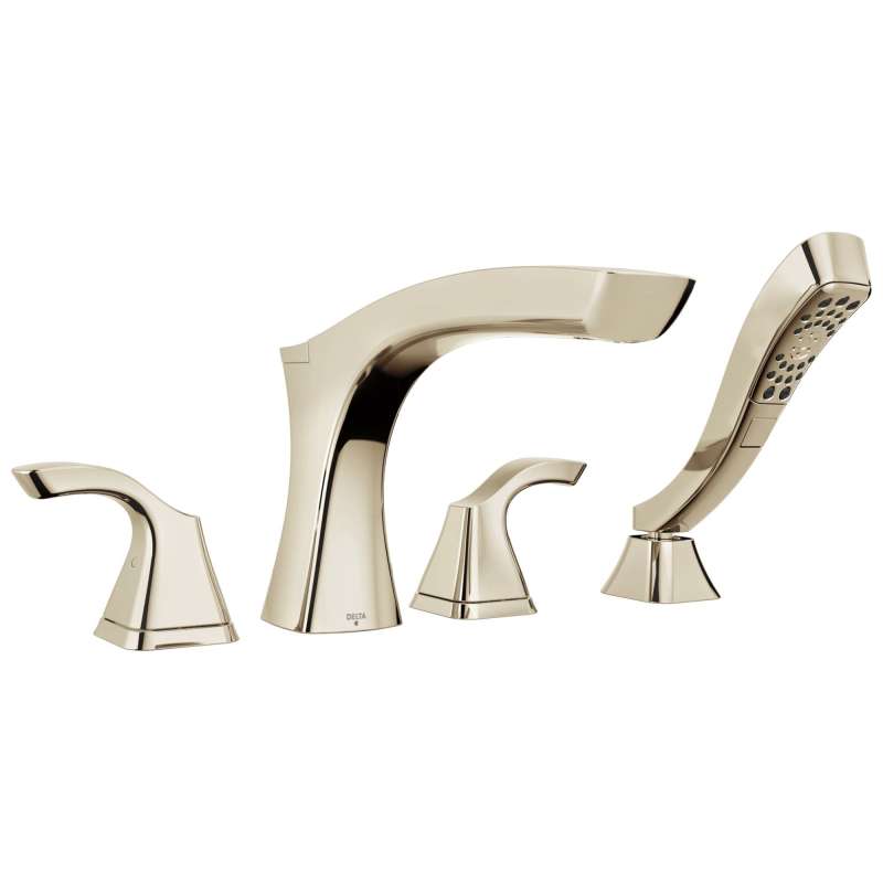 Complete your bath with a beautifully designed Delta roman tub faucet, meticulously crafted to turn heads and enhance your experience. The included hand shower makes this a versatile addition to your bath, perfect for rinsing off, washing loved ones and pets or keeping your tub clean. Delta H2Okinetic Hand Showers look different because they are different. Using advanced technology, H2Okinetic Hand Showers sculpt water into a unique wave pattern, giving you 3X the coverage of a standard shower head. The end result is a hand shower that provides more coverage, more warmth and more intensity for a truly drenching experience. Designed to look like new for life, Brilliance finishes are developed using a proprietary process that creates a durable, long-lasting finish that is guaranteed not to corrode, tarnish or discolor. This glossy finish provides a delicate elegance that can make almost any room pop. The polished surface reflects back deep shadows from your space, creating contrast within the pale gold tones which takes on a new light from every angle. Brilliance finishes are durable, long-lasting and guaranteed not to corrode, tarnish or discolor, so you can enjoy a coordinated bath you'll love to look at for life. You can install with confidence, knowing that Delta faucets are backed by our Lifetime Limited Warranty. Coverage measured in accordance with EPA WaterSense Specification for shower heads, March 4, 2010.