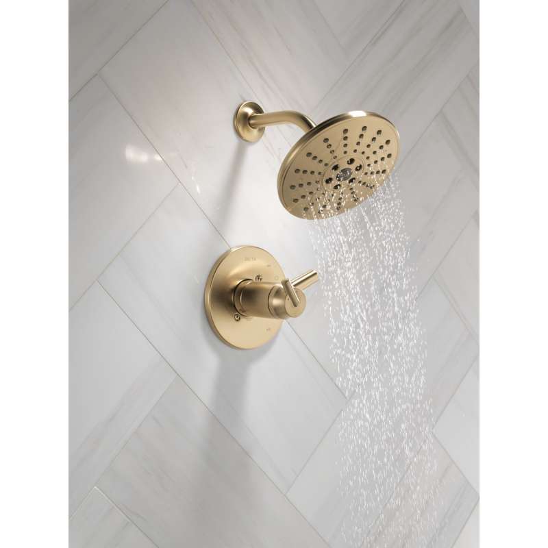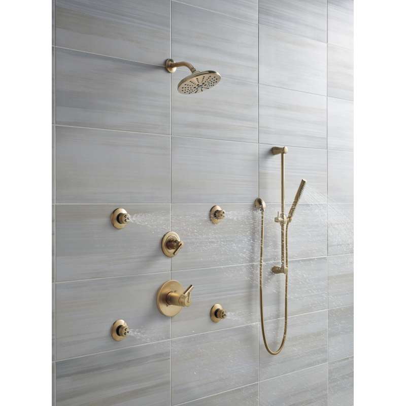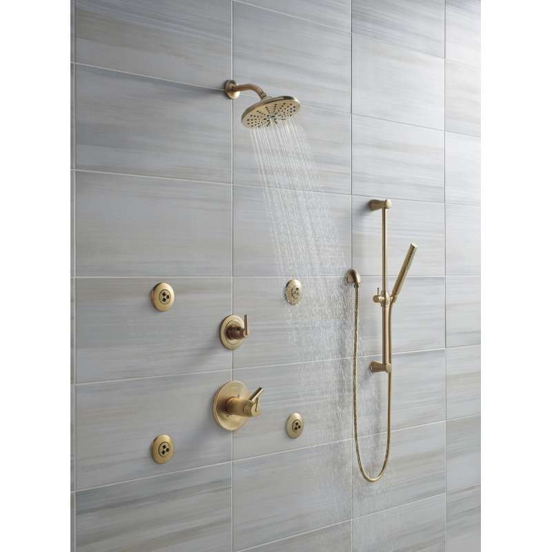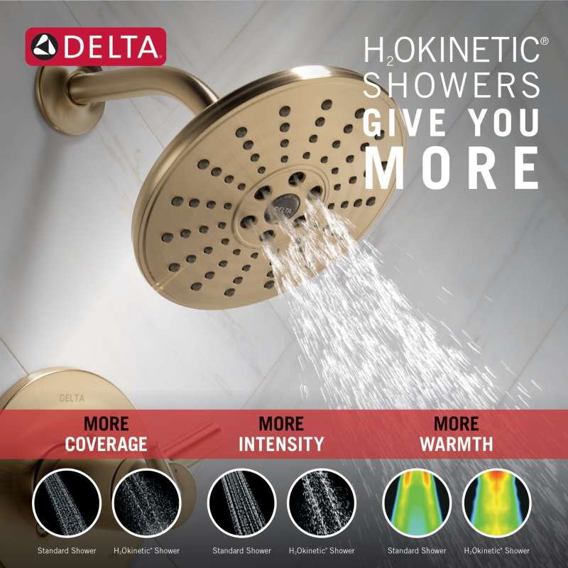 Delta h2okinetic showers look different because they are different. Using advanced technology, h2okinetic showers sculpt water into a unique wave pattern, giving you 3x the coverage of a standard shower head. The end result is a shower that provides more coverage, more warmth and more intensity for a truly drenching shower experience. With separate handles for volume and temperature control, this delta tub/shower provides a more refined showering experience. Simply set the water at your preferred temperature and turn the shower on or off with the volume control handle - without interrupting your set temperature. Designed to look like new for life, brilliance finishes are developed using a proprietary process that creates a durable, long-lasting finish that is guaranteed not to corrode, tarnish or discolor. The pause setting gives you ample space for shaving, lathering and other shower tasks, then easily restarts the water with the temperature where you left off. This spray setting helps you conserve water, so you can worry less about depleting your supply of hot water - and you help the environment too. Delta thermostatic valves use tempassure technology to protect you and your family from sudden temperature changes. Take the chill out of contemporary with the eloquent warmth of champagne bronze in your bath. This vibrant, gold finish provides a vivid splash of contrast to your space for a look that's simultaneously modern and nimble, able to pair elegantly with traditional, transitional and contemporary décor. Delta watersense labeled faucets, showers and toilets use at least 20% less water than the industry standard—saving you money without compromising performance.