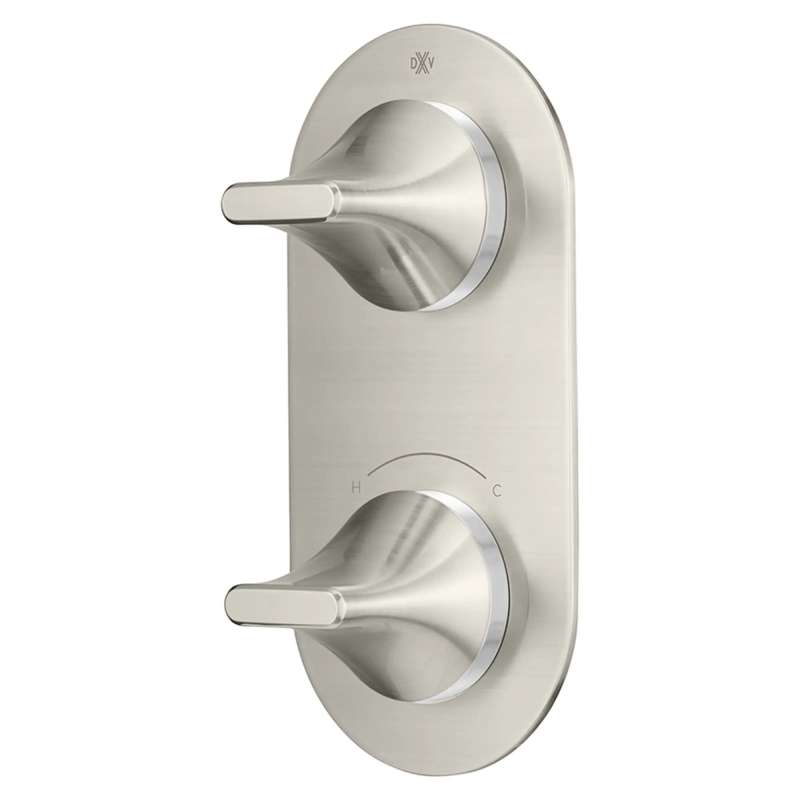 Sleek, modern, and deserving of the most luxurious bathroom setting, the DXV® Modulus 2-Handle Thermostatic Valve Trim complements the elegance of the entire DXV® Modulus collection. Combining beauty and functionality, the top handle controls on/off and water volume; the bottom handle controls water temperature. Thin profile maintains the clean, uncluttered look essential in a custom shower.