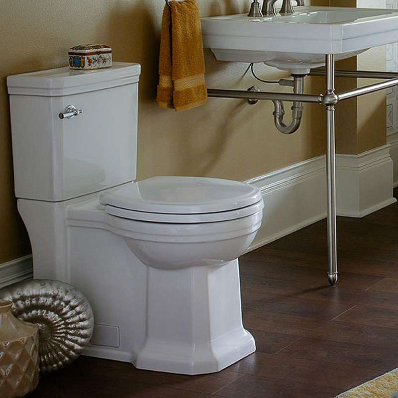 - The Fitzgerald Two-Piece Round Front Toilet from DXV is inspired by industrial design with controlled contours and simplified geometry, making it a handsome addition to any bathroom space. This water-saving luxury toilet is part of the Fitzgerald Collection, which pays homage to the literary flair, style and subtle decadence of a true American original. With a vintage flair and a well-tailored attitude that exudes the sophistication and timeless appeal of the Jazz Age, the Fitzgerald Round Front Toilet boasts features such as the PowerWash rim that scrubs the bowl with each flush, and the EverClean surface that prevents the growth of bacteria, mold, and mildew with a special, stain-resistant glaze on the toilet’s surface. The Fitzgerald toilet meets ADA compliance guidelines for handicap accessible use, and is also an EPA WaterSense-certified product, using far less water (1.28 gallons per flush) than the average toilet. This toilet comes complete with a 3-inch flush valve with a chemical-resistant flapper and a Duroplast slow-close seat.