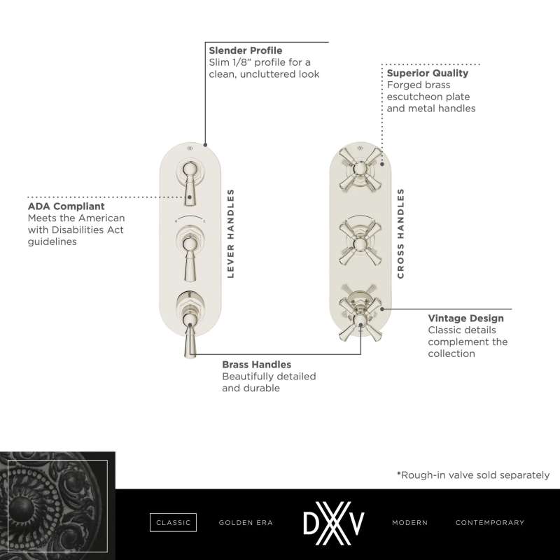 The Oak Hill Three-Handle Thermostatic Valve Trim from DXV brings the charm and lasting appeal of the traditional farmhouse aesthetic into today’s home. Designed to preserve the authenticity and spirit of the period, the Oak Hill Trim, with its clean, slim profile, reflects the simple, stoic character that balances utility and beauty in statement-making style. The Oak Hill Trim is part of the Oak Hill Collection, a complete, curated bathroom suite for the well-appointed home. Available in four beautiful finishes.
