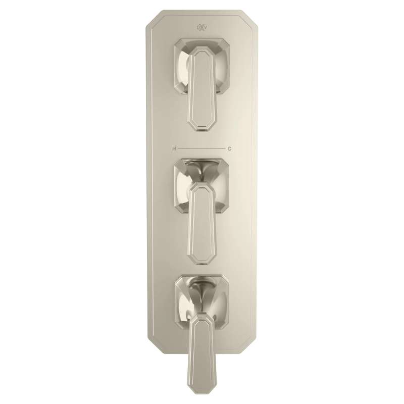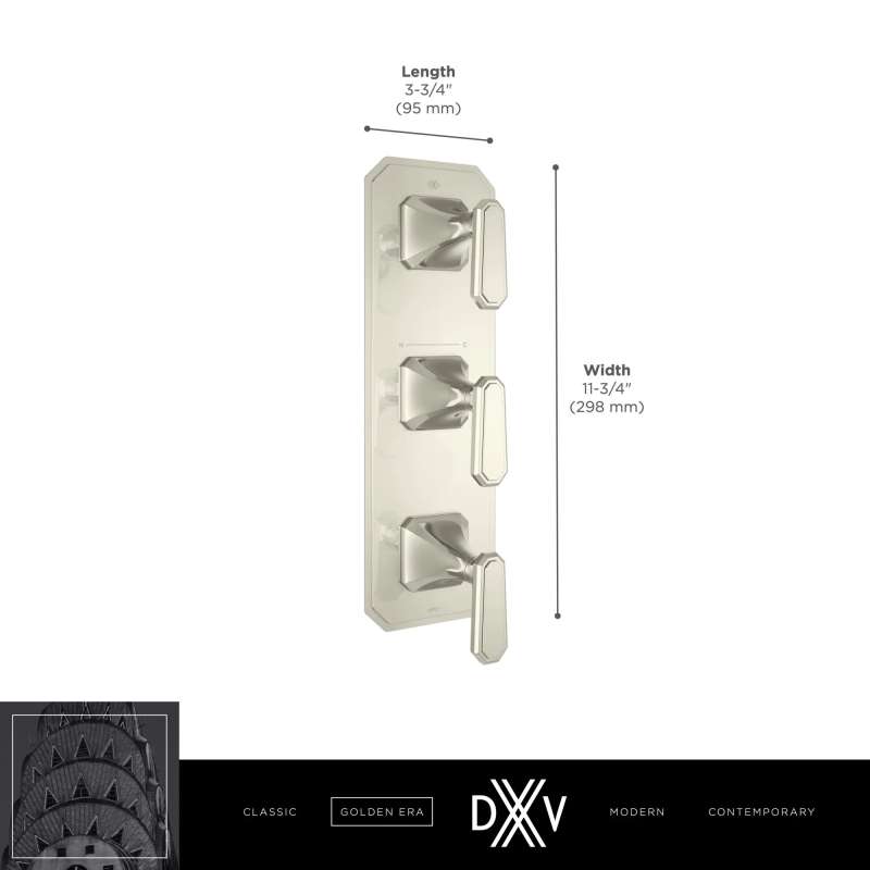 Crafted with meticulous attention to every detail, the Belshire Three-Handle Thermostatic Valve Trim from DXV succeeds in capturing the opulence and glamour of the Art Deco period, reimagined for today. Rich in character and substance, this distinctive trim is defined by faceted edges and precision engineering for superior performance. Available in four beautiful finishes.