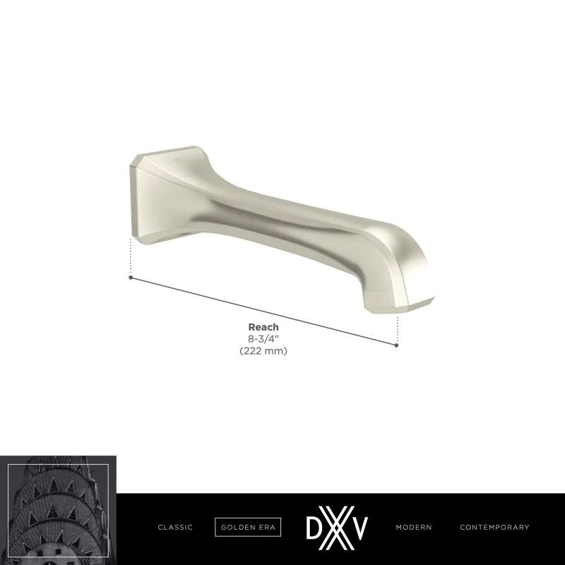 The Belshire Wall Tub Spout from DXV captures the opulence and glamour of the Art Deco period, reimagined for today. Rich in character and substance, this tub spout reflects the design aesthetic of the Belshire Collection and is defined by precise faceted details. Available in four beautiful finishes.