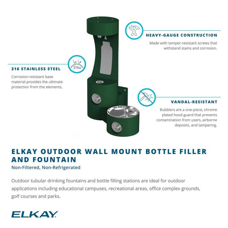Outdoor Bottle Filling Stations ideal for educational campuses and recreational areas. Powder-coated exterior over a corrosion-resistant, 300 Series stainless steel base material to provide protection from the elements.