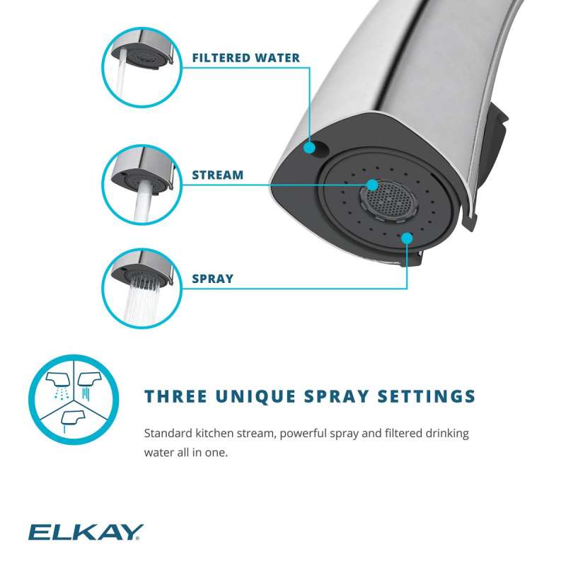• THREE UNIQUE SPRAY SETTINGS: Standard kitchen stream, powerful spray and filtered drinking water all in one.