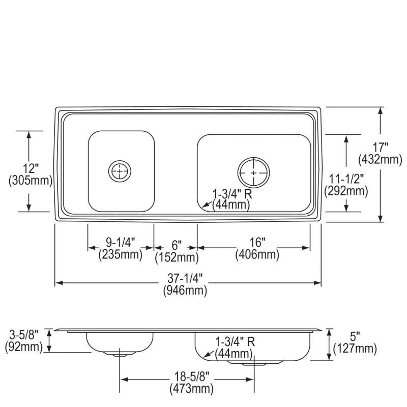 | Countertop Cutout Dimensions | 36-5/8" x 16-3/8" (930mm x 416mm) with 1-1/2" (38mm) corner radius |