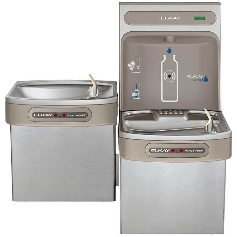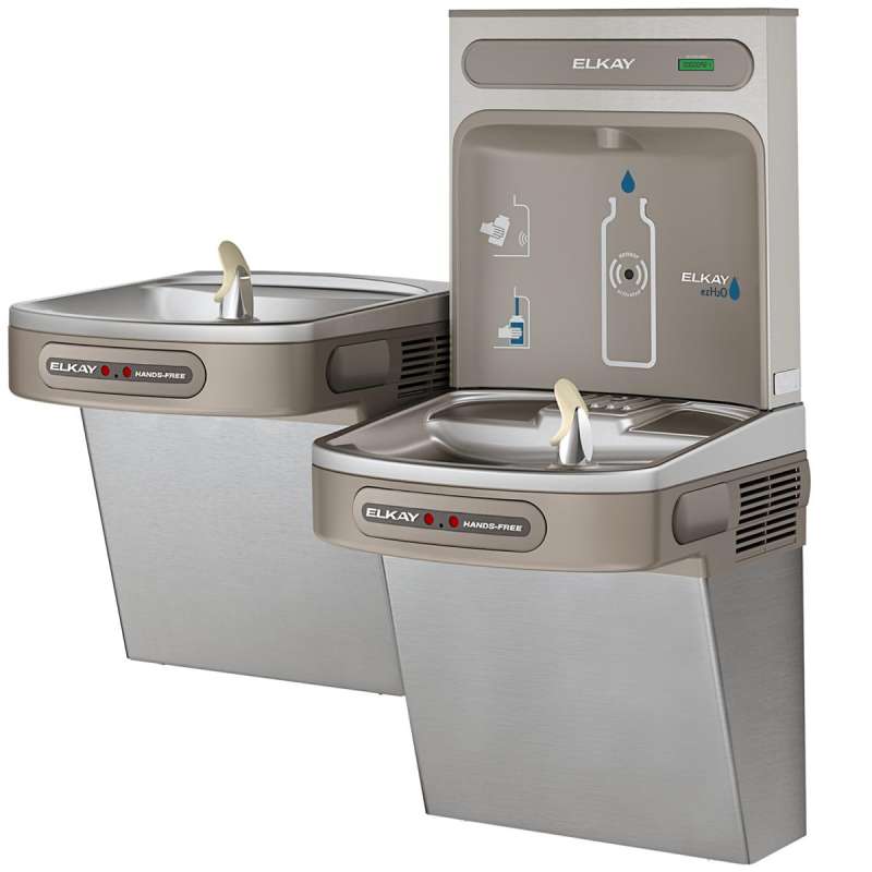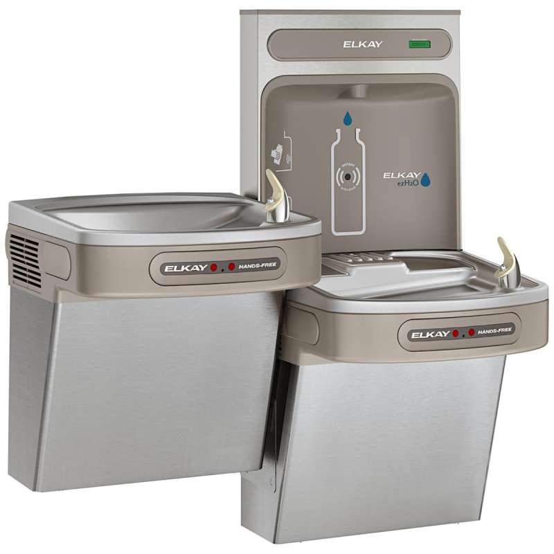 The Elkay EZH2O Bottle Filling Station delivers a clean quick water bottle fill and enhances sustainability by minimizing our dependency on disposable plastic bottles. Complete hands-free cooler and bottle filling station in a consolidated space saving ADA compliant design. NEW Versatile Bi-Level cooler design allows for standard cooler installation of high-left/low-right or the alternate reverse cooler installation.