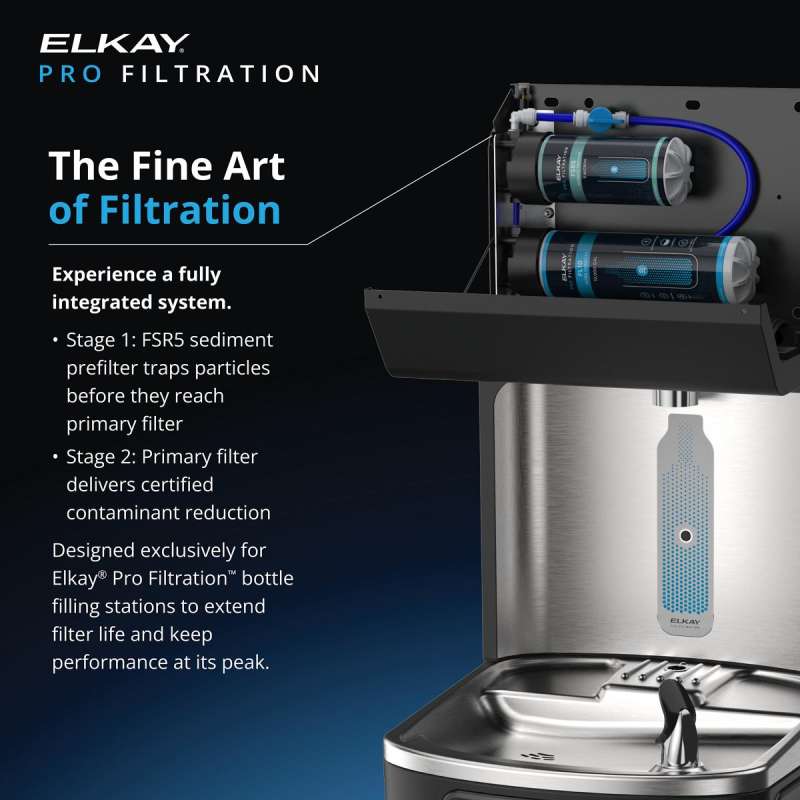 Get more uptime, simplified maintenance and reliability from Elkay Pro Filtration bottle filling stations - the next generation of bottle filling stations from the brand you trust. With an advanced filtration system and innovative design, maintaining filtered drinking water is easier than ever. Filters are accessible from the top of the bottle filling station for easy filter changes in a matter of seconds. They're compatible with Elkay Pro Filtration filters, which offer high-capacity filtration up to 10,000 gallons and high reduction of contaminants, such as total PFAS, lead, microplastics, copper, asbestos and more. Enhance your system's filtration with our stage 1 sediment filter, which reduces sediment buildup caused by municipal water supply.