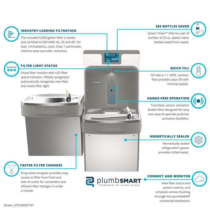 Elkay filtration bottle filling stations deliver safer, filtered drinking water in seconds while enhancing any space with their bold colors. They pair with our commercial-grade WaterSentry filters to reduce many contaminants, such as PFOA/PFOS (PFAS), lead, microplastics and more. This line of filtered bottle filling stations features sensor-activated bottle filling for a more hygienic and touchless experience. Stations also include one or two drinking fountains that also dispense filtered water while minimizing use of disposable plastic bottles. Filter maintenance is easy with the integrated drop-down quick filter change wrapper. It provides direct access to the filter for fast filter replacements, and the automatic filter reset and intuitive LED filter status lights accurately display filter capacity for timely replacements. Bold, eye-catching colors complement high-end, architectural interiors and enhance office spaces, gyms, and more.