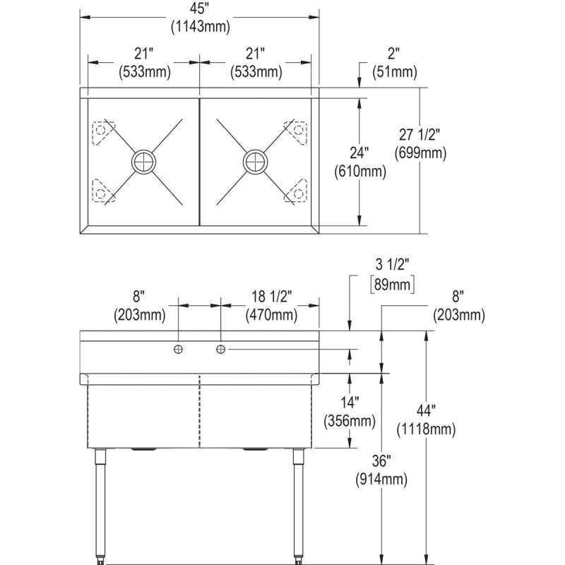 - Sink supported on (4) LK251 stainless steel adjustable tubular legs