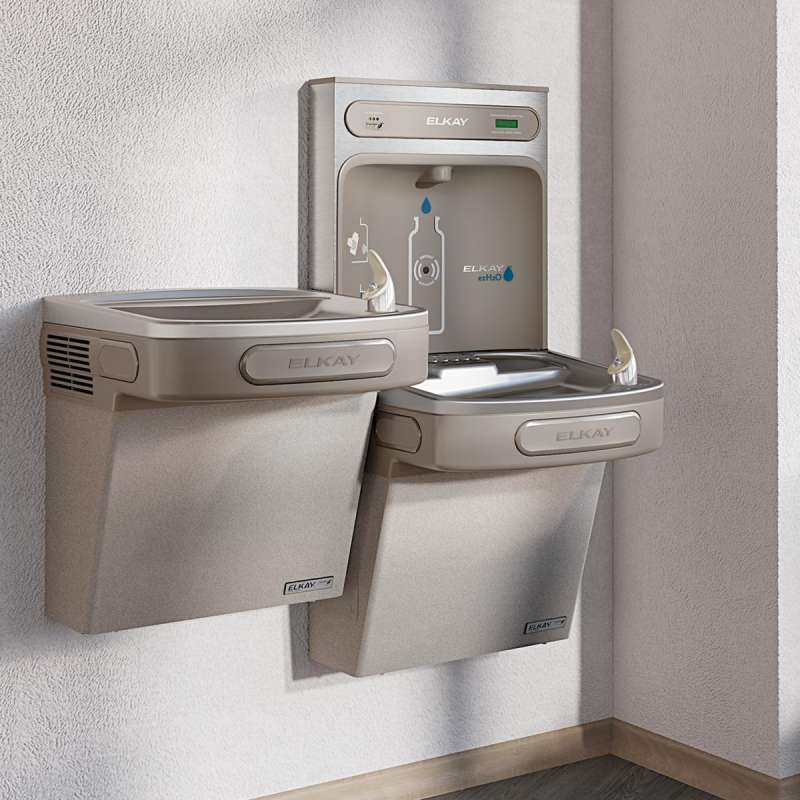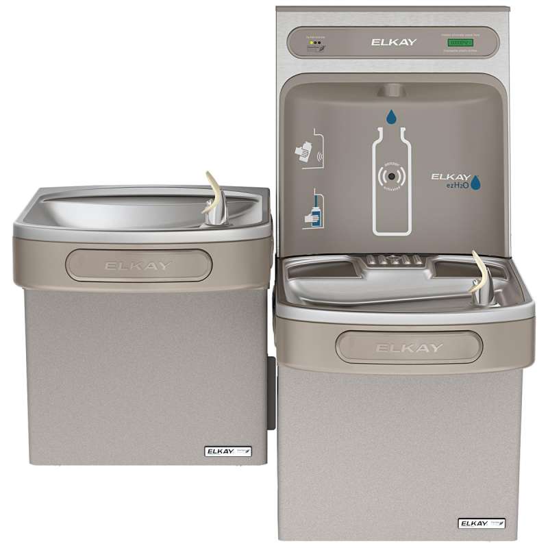 The Elkay EZH2O Bottle Filling Station delivers a clean quick water bottle fill and enhances sustainability by minimizing our dependency on disposable plastic bottles. Complete cooler and bottle filling station in a consolidated space saving ADA compliant design. NEW Versatile Bi-Level cooler design allows for standard cooler installation of high-left/low-right or the alternate reverse cooler installation.