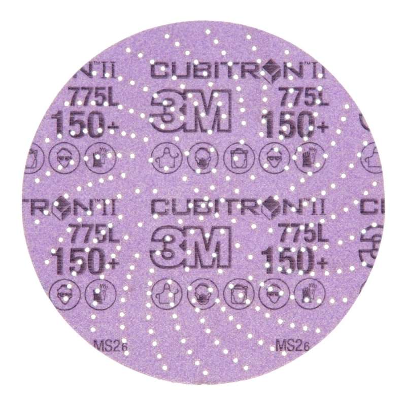 3M Xtract™ Cubitron™ II Disc 775L features a 3M proprietary multi-hole pattern for improved dust extraction in finishing applications. Part of the 3M Xtract™ Series, designed for optimal dust removal. An innovative multi-hole pattern extracts dust better than 5- or 6-hole products — increasing cut and dramatically increasing disc life. The design does not need to align with the disc pad holes, making switching the discs fast, easy and convenient. Featuring ceramic 3M Precision-Shaped Grain, a revolutionary advancement in abrasive technology. The triangular shaped ceramic mineral is designed to slice through the substrate, rather than gouging or “plowing” like conventional abrasives, resulting in a disc that cuts up to 2x as fast as conventional abrasives. The film backing delivers outstanding tear resistance, flexibility and a consistent, uniform finish on a variety of substrates. These discs are ideal for a broad range of applications focused primarily on stock removal, and are effective on a wide variety of substrates, including metals, composites, gelcoat, and whitewood. The film backing offers greater tear resistance than paper discs, for additional durability and edge retention. For best results, pair with 3M™ Elite Random Orbital Sanders. 3M offers a complete line of hook-and-loop style 3M™ Hookit™ discs for work spaces where adhesive backed discs may become contaminated by dust or dirt. They are often used in applications where a 3M™ Stikit™ disc may be too aggressive, as Hookit™ discs tend to leave finer finishes than adhesive backed discs. Hookit™ sanding discs conveniently attach to a hook-and-loop backup disc pad (sold separately), can be removed cleanly and easily, and can be re-used again and again for the extent of the abrasive life. Sandpaper discs cut better and last longer when dust isn't loading the cutting surface of the abrasives. 3M's proprietary multi-hole pattern on Clean Sanding products evacuates dust at a higher rate than 5- or 6-hole products. This hole design doesn't require alignment of holes with the disc pad, making disc changes quick and simple. Open coat construction means the abrasive grains are placed with space between them to help evacuate dust and other sanding debris and avoid clogging the cutting edge of the grains. The load-resistant coating allows the disc to continue cutting even when sanding softwoods, paints, and other materials that would, otherwise, clog the disc and hinder sanding ability. All of this adds up to increased productivity and reduced material consumption. For maximum dust extraction, use this disc with a 3M™ Hookit™ Clean Sanding pad and a random orbital sander with vacuum (both sold separately).