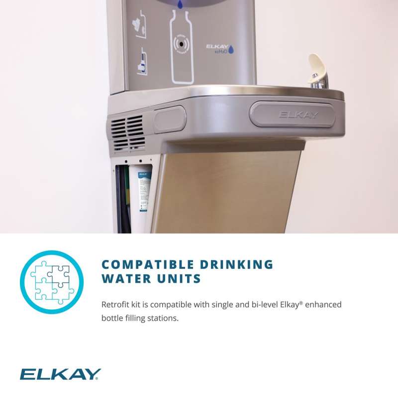 - Retrofit kit is compatible with Elkay EZ/LZ bi-level filtered coolers and bottle filling stations