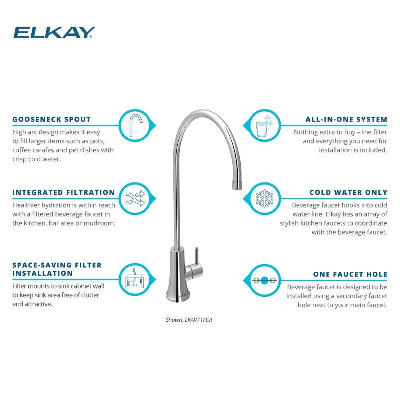 • COLD WATER ONLY: Beverage faucet hooks into cold water line. Elkay offers an array of stylish kitchen faucets to coordinate with beverage faucet