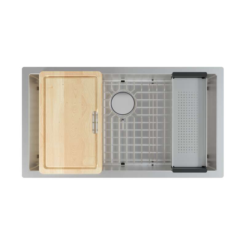 - Workcenter Sink: Comes with everything you need for a fully equipped kitchen sink workstation, including a stainless-steel bottom grid, stainless steel colander, wood cutting board, drain cover, and strainer assembly.