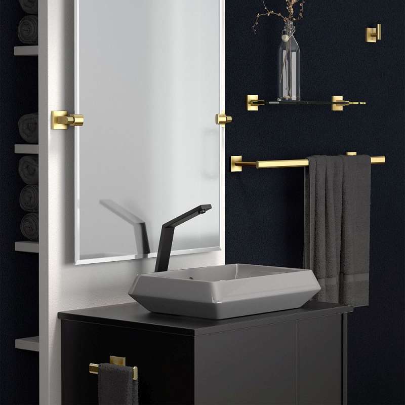 - Kit includes 24-in towel bar, towel ring, toilet paper holder, robe hook