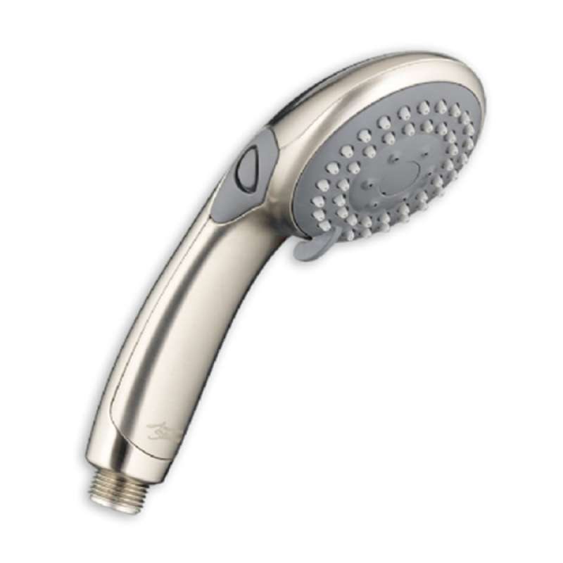 Hand shower has pause feature on handle to provide a non-positive shut-off that reduces the flow to a trickle. 3-Function hand shower adjusts from full spray to a combination to a massage. Easy clean rubber spray nozzles. Includes pressure compensating flow regulator and check valve. Hand showers available in 2 versions (1.5 gpm/5.7 L/min and 2.5 gpm/9.5 L/min. maximum flow rate.