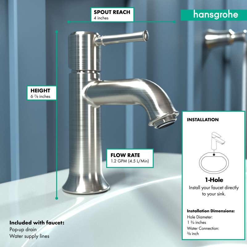 Design With a range of models and styles, paired with the quality and design you expect from hansgrohe, dream bathrooms become a reality. Bath faucets by hansgrohe exude beautiful design with superior performance and durability. Pick your desired faucet, then browse the entire product suite for complementary accessories. German engineering ensures a lifetime of consistent and dependable operation. Maintenance Products that function perfectly are essential. To ensure that they do, every hansgrohe product 100% air tested in production. hansgrohe faucets feature a silicone aerator that optimizes water flow performance, resists mineral deposit build-up, and is designed to be easily wiped clean. Installation Can be installed in existing 1 or 3 hole counter configurations. Standard 3/8-inch pipe connection hoses included (attached). Baseplate sold separately. Please comply with all local, state, and federal plumbing codes and regulations. Installation instruction link below. Customer Support customerservice@hansgrohe.com | 1 (800) 334-0455 | Limited Lifetime Warranty | Installation / User Guide / Warranty PDF links below