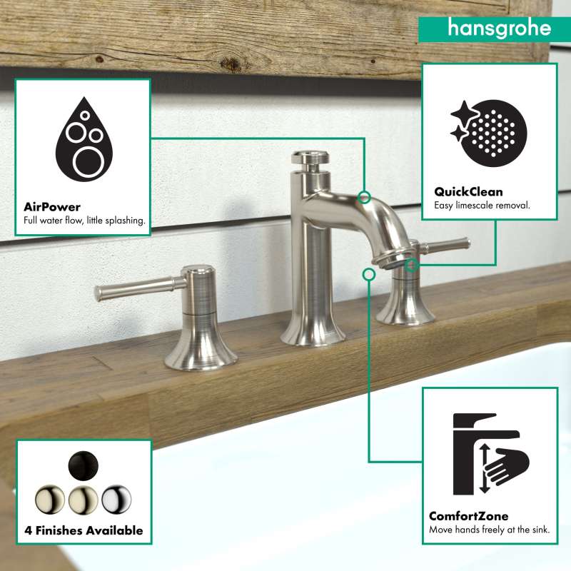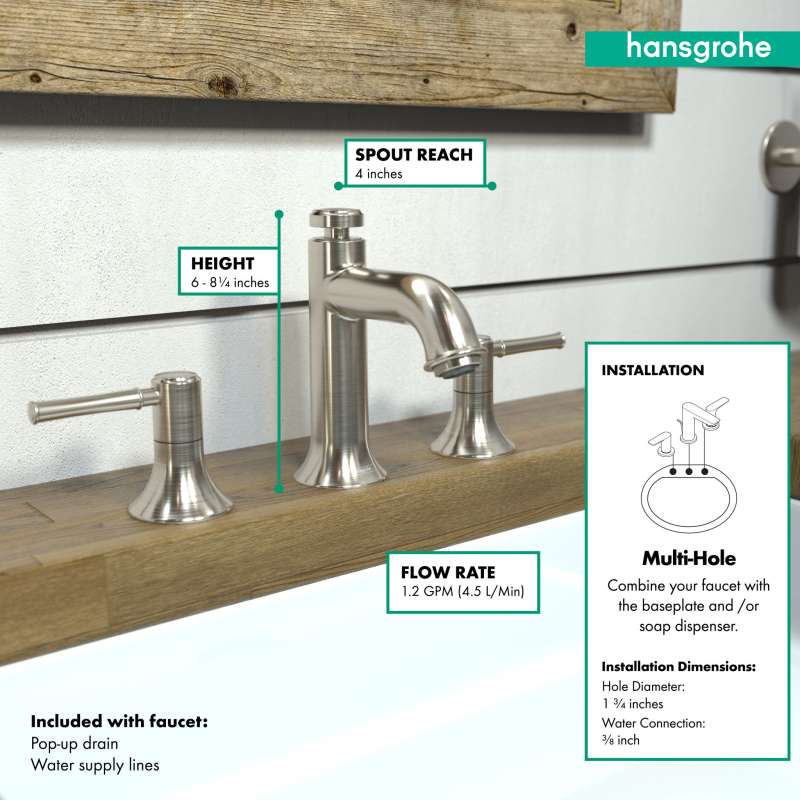 Design With a range of models and styles, paired with the quality and design you expect from hansgrohe, dream bathrooms become a reality. Bath faucets by hansgrohe exude beautiful design with superior performance and durability. Pick your desired faucet, then browse the entire product suite for complementary accessories. German engineering ensures a lifetime of consistent and dependable operation. Maintenance Products that function perfectly are essential. To ensure that they do, every hansgrohe product 100% air tested in production. hansgrohe faucets feature a silicone aerator that optimizes water flow performance, resists mineral deposit build-up, and is designed to be easily wiped clean. Installation Can be installed in existing 1 or 3 hole counter configurations. Standard 3/8-inch pipe connection hoses included (attached). Baseplate sold separately. Please comply with all local, state, and federal plumbing codes and regulations. Installation instruction link below. Customer Support customerservice@hansgrohe.com | 1 (800) 334-0455 | Limited Lifetime Warranty | Installation / User Guide / Warranty PDF links below