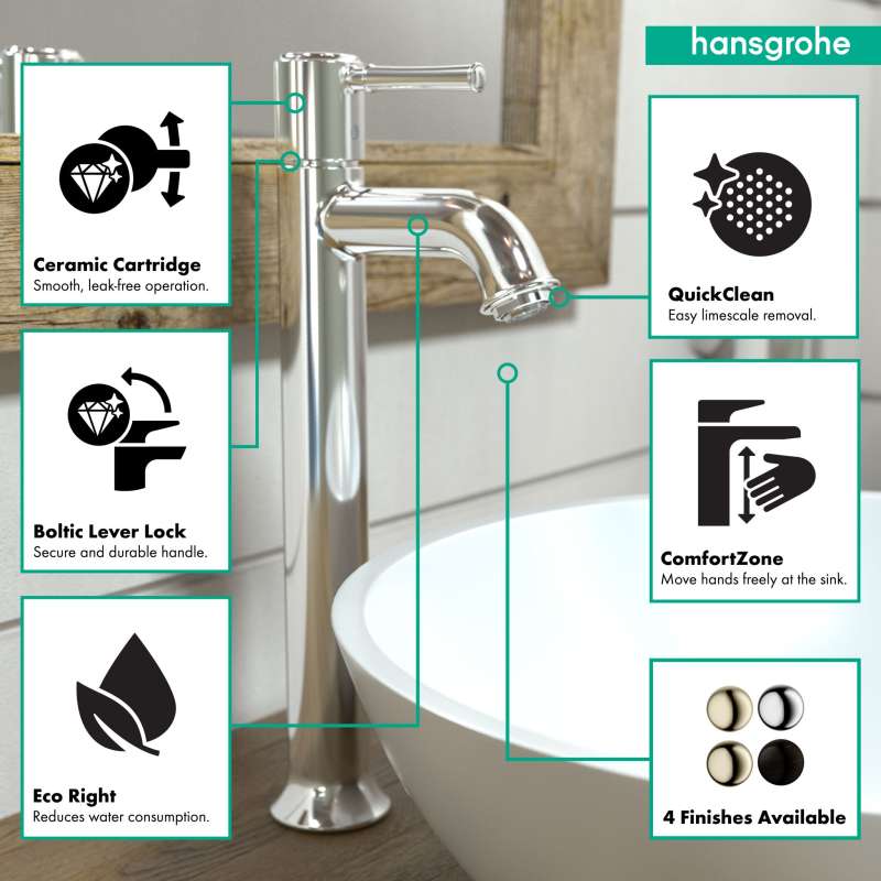 Design With a range of models and styles, paired with the quality and design you expect from hansgrohe, dream bathrooms become a reality. Bath faucets by hansgrohe exude beautiful design with superior performance and durability. Pick your desired faucet, then browse the entire product suite for complementary accessories. German engineering ensures a lifetime of consistent and dependable operation. Maintenance Products that function perfectly are essential. To ensure that they do, every hansgrohe product 100% air tested in production. hansgrohe faucets feature a silicone aerator that optimizes water flow performance, resists mineral deposit build-up, and is designed to be easily wiped clean. Installation Can be installed in existing 1 or 3 hole counter configurations. Standard 3/8-inch pipe connection hoses included (attached). Baseplate sold separately. Please comply with all local, state, and federal plumbing codes and regulations. Installation instruction link below. Customer Support customerservice@hansgrohe.com | 1 (800) 334-0455 | Limited Lifetime Warranty | Installation / User Guide / Warranty PDF links below