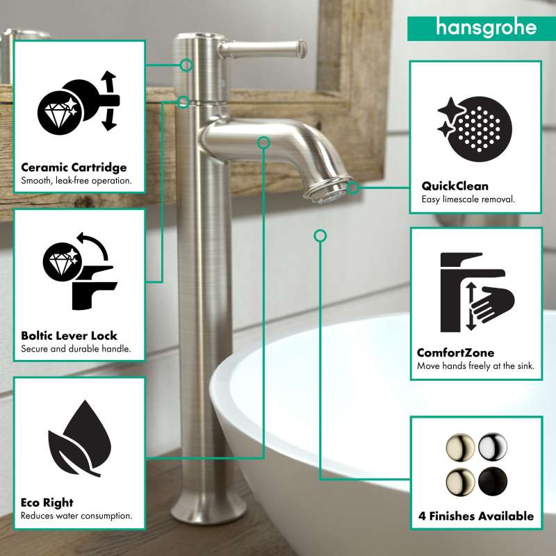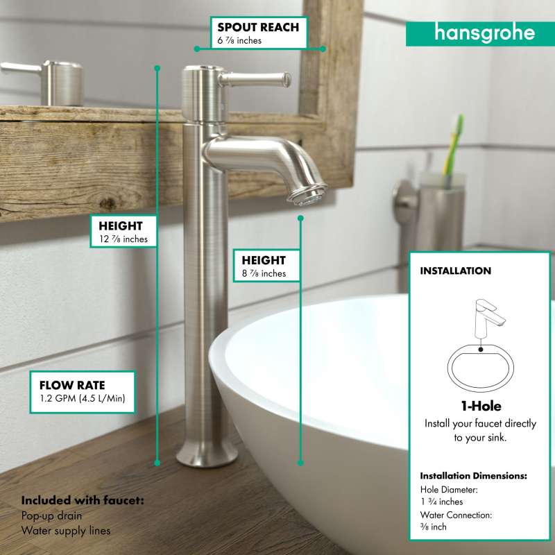 Design With a range of models and styles, paired with the quality and design you expect from hansgrohe, dream bathrooms become a reality. Bath faucets by hansgrohe exude beautiful design with superior performance and durability. Pick your desired faucet, then browse the entire product suite for complementary accessories. German engineering ensures a lifetime of consistent and dependable operation. Maintenance Products that function perfectly are essential. To ensure that they do, every hansgrohe product 100% air tested in production. hansgrohe faucets feature a silicone aerator that optimizes water flow performance, resists mineral deposit build-up, and is designed to be easily wiped clean. Installation Can be installed in existing 1 or 3 hole counter configurations. Standard 3/8-inch pipe connection hoses included (attached). Baseplate sold separately. Please comply with all local, state, and federal plumbing codes and regulations. Installation instruction link below. Customer Support customerservice@hansgrohe.com | 1 (800) 334-0455 | Limited Lifetime Warranty | Installation / User Guide / Warranty PDF links below