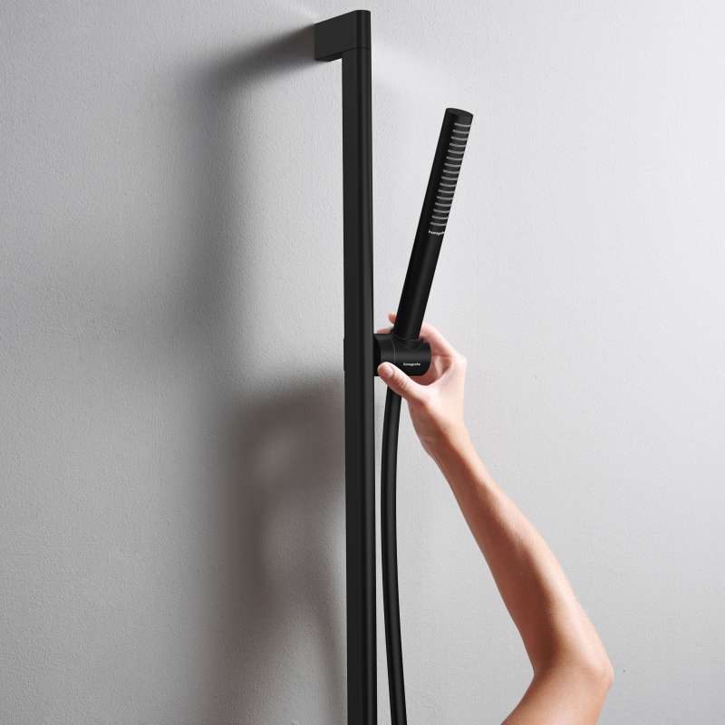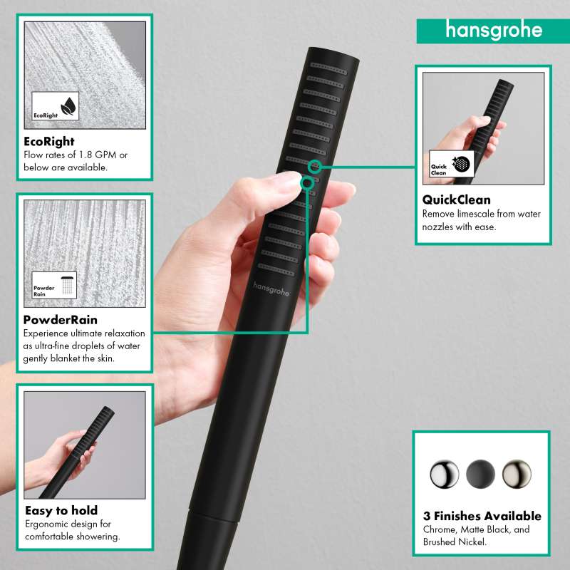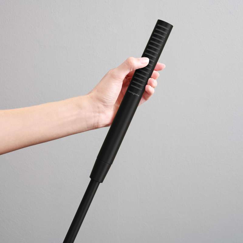 Designer shower head for a sense of well-being: Pulsify S baton shower in Matte black with PowderRain The Pulsify S 100 1-spray baton shower from hansgrohe fulfils the desire for an innovative and modern shower head for daily feel-good showers. The unique hansgrohe PowderRain spray type wraps your body in a glove of the finest water droplets, creating a source of relaxation. The spray nozzles, arranged over the large area of the cylindrical shower head, ensure the water is perfectly distributed. The strikingly minimalist design makes the baton shower a real eye-catcher when customizing the bathroom and is accented by multiple finishes. ranging from polished chrome, Matte black, and a classic brushed nickel finish.