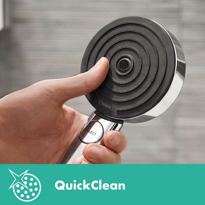 Water-saving shower kit with PowderRain: Pulsify Select 105 with 24-inch shower rail The Pulsify Select 105 shower set by hansgrohe with its 24-inch wallbar is perfect for that feel-good shower. There are three different shower sprays choose from, and you can switch between them at the touch of a button (Select): hansgrohe PowderRain gently wraps the body in the finest of water droplets. IntenseRain invigorates and is perfect for rinsing out shampoo. And as third Spray type, a powerful massage spray provides the necessary pampering. One look at the new type of spray disc in modern graphite gray and you know: Pulsify focuses on people. The ring-shaped nozzles that circle around the 4.1-inch shower head are reminiscent of gentle movements of water. The timeless design and its round shower head makes Pulsify the ideal companion to enhance your bathroom ambience. The shower holder can be continuously adjusted with one hand using the push slider. What a convenient way to get the shower head into the right position. The special fixture prevents the 63-inch long shower hose from getting all twisted.